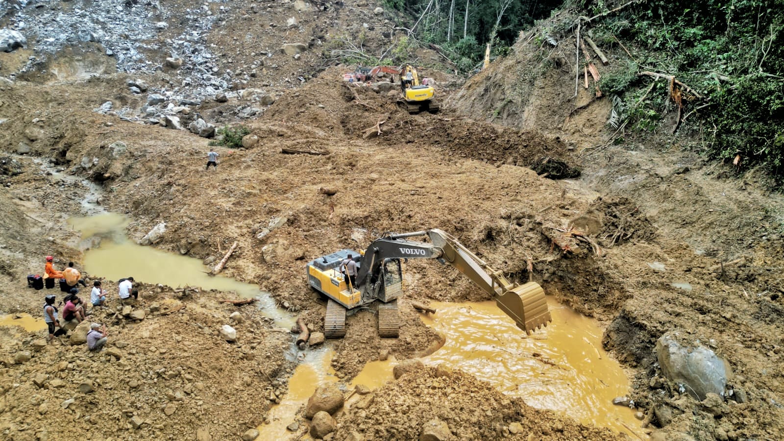 Tiga alat berat lagi bertugas melakukan pengorekan dan menyingkir material longsor sembari mencari korban di titik longsor.