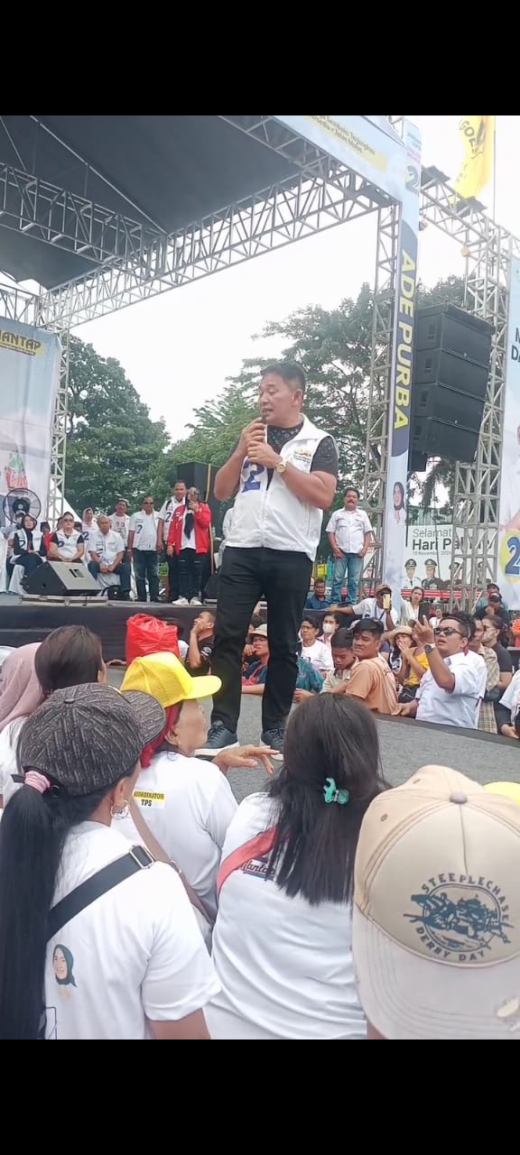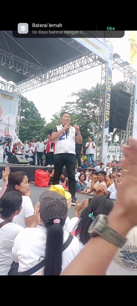 Sebelum Mangatas berorasi, Ade Sandrawati Purba tampil semangat menyapa massa. Ia mengaku senang bisa hadir di tengah-tengah ribuan pendukung Paslon Nomor 2.