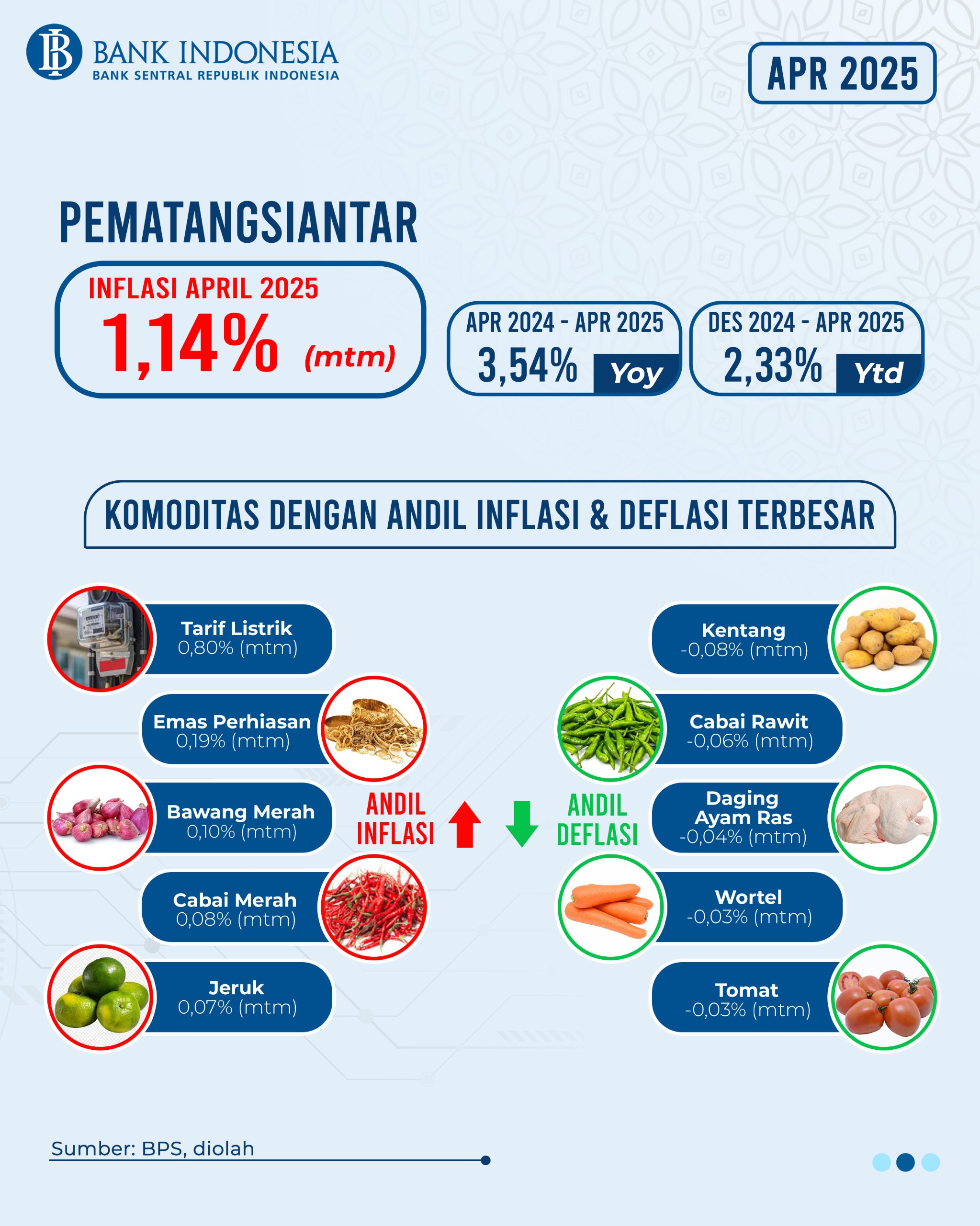 Mengenai perkembangan inflasi di periode April 2025, Muqorobin menjelaskan Pematangsiantar mengalami inflasi 1,14 persen (mtm), 3,54 persen (yoy) dan 2,33 persen (ytd), Labuhanbatu 1,25 persen (mtm), 1,49 persen (yoy) dan 1,47 persen (ytd), Sumut 1,35 persen (mtm), 2,09 persen (yoy) dan 1,46 persen (ytd) serta nasional 1,17 persen (mtm), 1,95 persen (yoy) dan 1,56 persen (ytd).