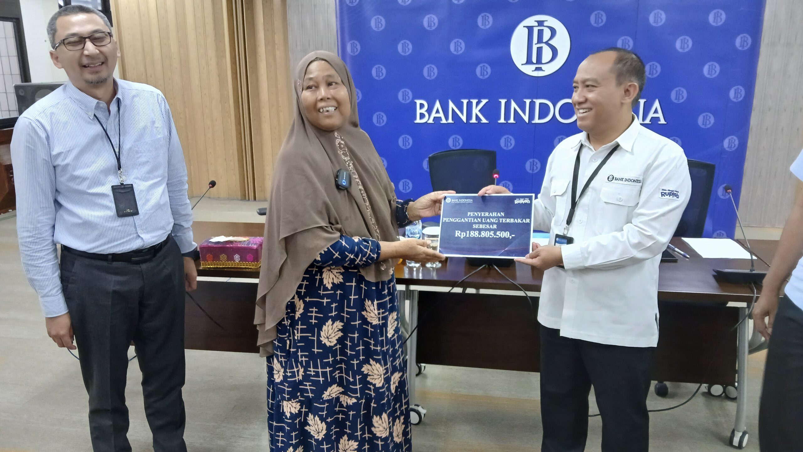 Kantor Perwakilan Bank Indonesia (KPw – BI) Pematangsiantar menyerahkan secara simbolis pengganti uang yang terbakar kepada Ibu Rahmawati warga Perdagangan dan Bapak Endri warga Bilah Hulu, Labuhanbatu bertempat di Lantai IV kantor BI jalan H Adam Malik Pematangsiantar, Senin (13/5/2024).