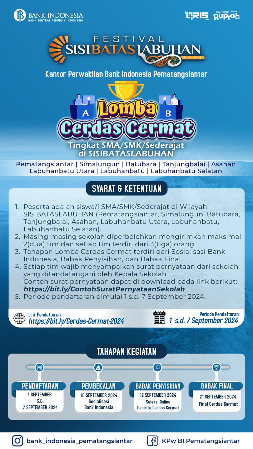 Kantor Perwakilan Bank Indonesia Pematangsiantar akan menggelar Lomba Cerdas Cermat untuk tingkat SMA/SMK sederajat di SISIBATASLABUHAN yang meliputi wilayah Pematangsiantar, Simalungun, Batubara, Asahan, Tanjung Balai, Labuhan Batu Utara, Labuhan Batu, dan Labuhan Batu Selatan.