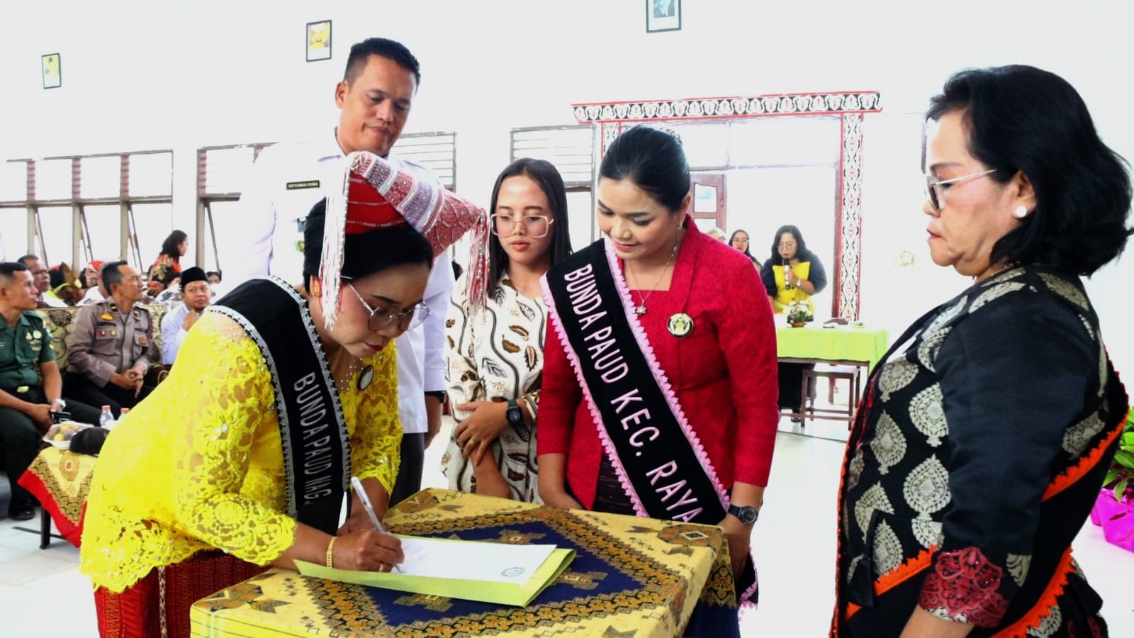 Bunda PAUD (Pendidikan Anak Usia Dini) Kabupaten Simalungun Ny Ratnawati Radiapoh Hasholan Sinaga menghadiri pengukuhan Bunda PAUD Nagori dan Kelurahan se-Kecamatan Raya.