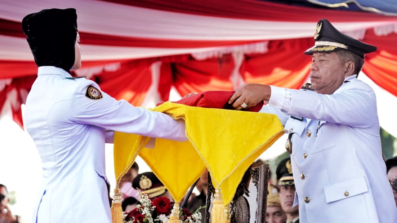 Diva Natasya Purba (Siswi SMA Negeri 1 Panombeian Panei) bertugas sebagai pembawa baki menerima bendera merah putih dari Inspektur Upacara (Bupati Simalungun).