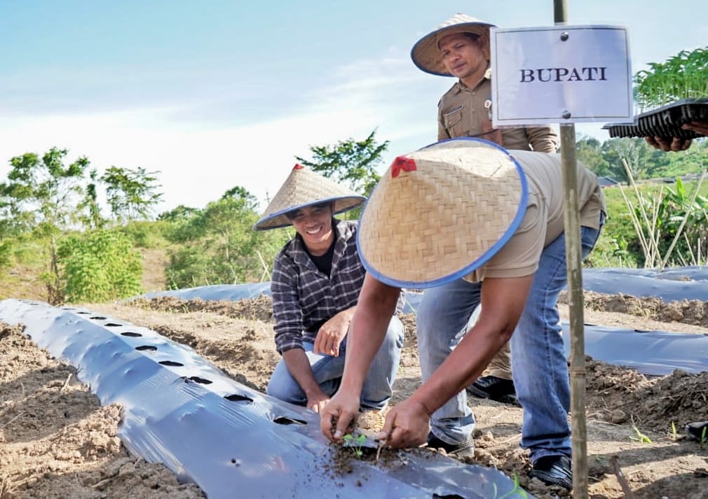 Bupati Simalungun Radiapoh Hasiholan Sinaga (RHS) melakukan penanaman cabai dengan metode Fertigasi (irigasi tetes) di sekitar lokasi TPA di Kecamatan Panombean Panei, Simalungun, Sumut, Selasa (16/7/2024).
