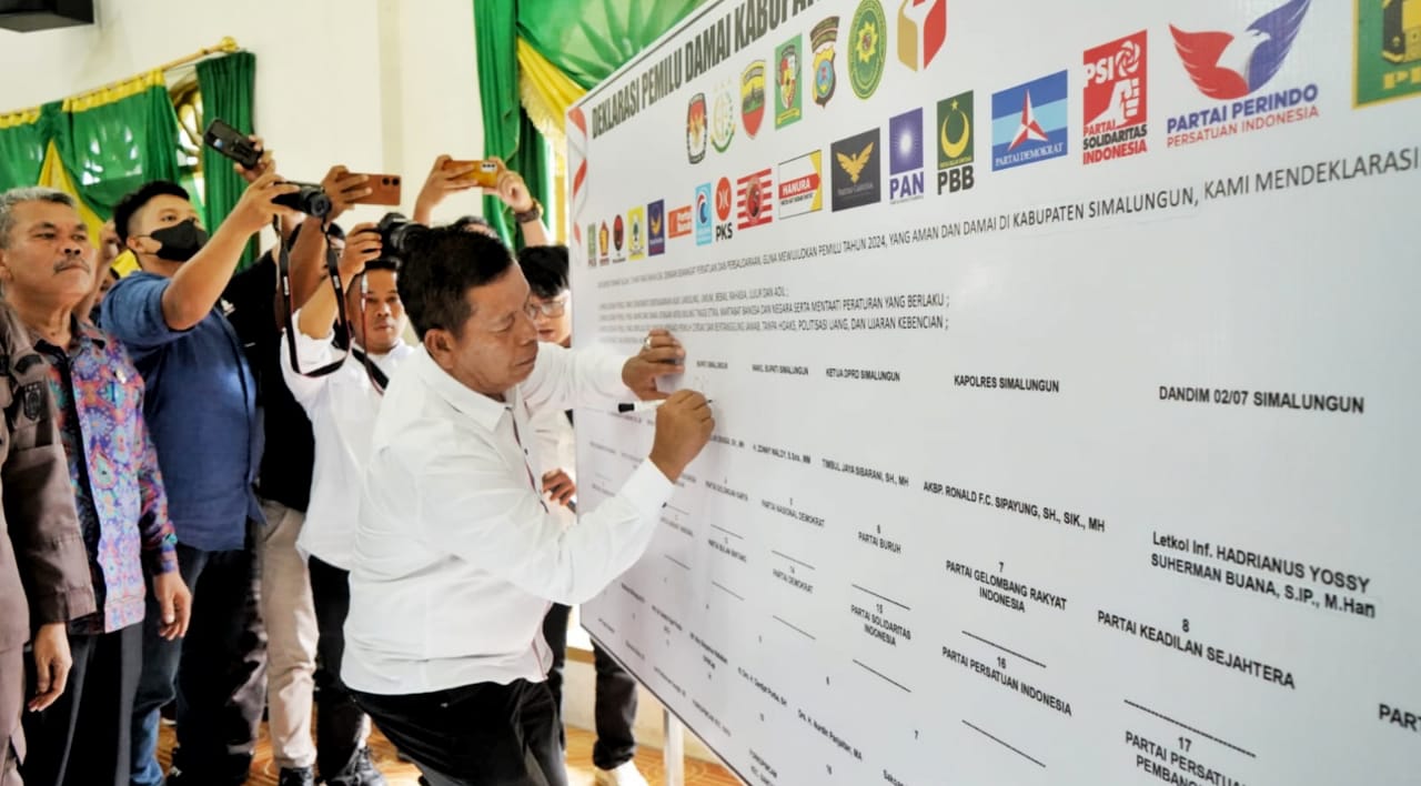 Penandatangan tersebut berlangsung dalam rapat Deklarasi Pemilu Damai Kabupaten Simalungun Tahun 2024, di gedung MUI Simalungun, Jalan Asahan, Kecamatan Siantar, Simalungun, Sumut, Kamis (12/10/2023).