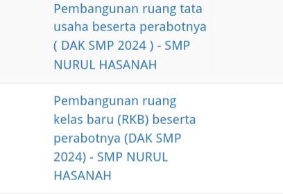 Yayasan SMP Nurul Hasanah mendapat bantuan DAK 2024 berupa pembangunan RKB beserta perabotnya senilai Rp 827.451.000,- dan pembangunan Ruang Tata Usaha senilai Rp 276.231.000,- sehingga dinilai tidak tepat sasaran karena sekolah tersebut telah memiliki sarana dan prasana yang luas dan memenuhi standart.
