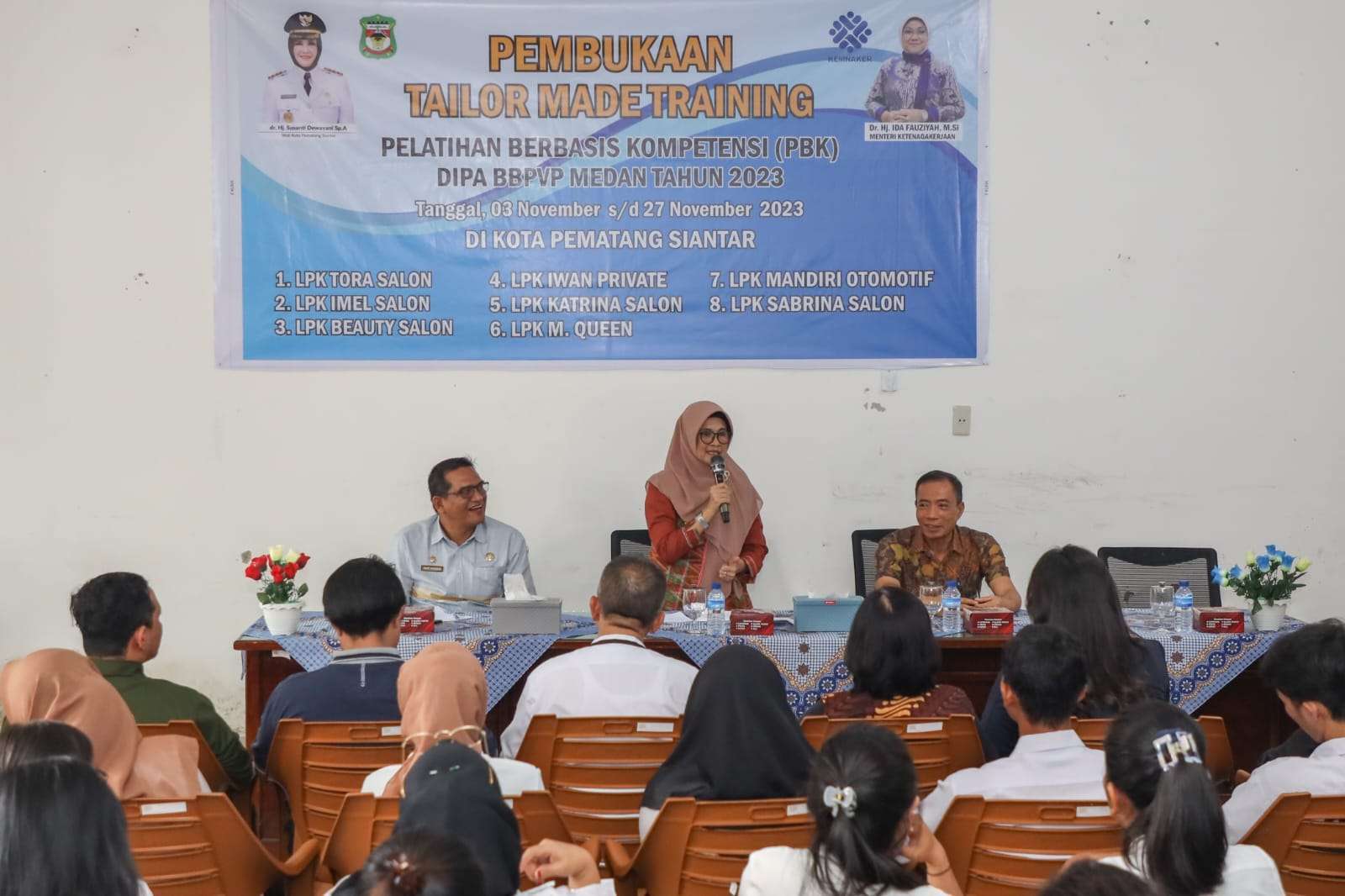 Wali Kota Pematang Siantar dr Susanti Dewayani SpA membuka Tailor Mode Training Pelatihan Berbasis Kompetensi (PBK) Direktorat Jenderal Pelatihan (DIPA) Balai Besar Pelatihan Vokasi Produktivitas (BBPVP) Medan Tahun 2023.