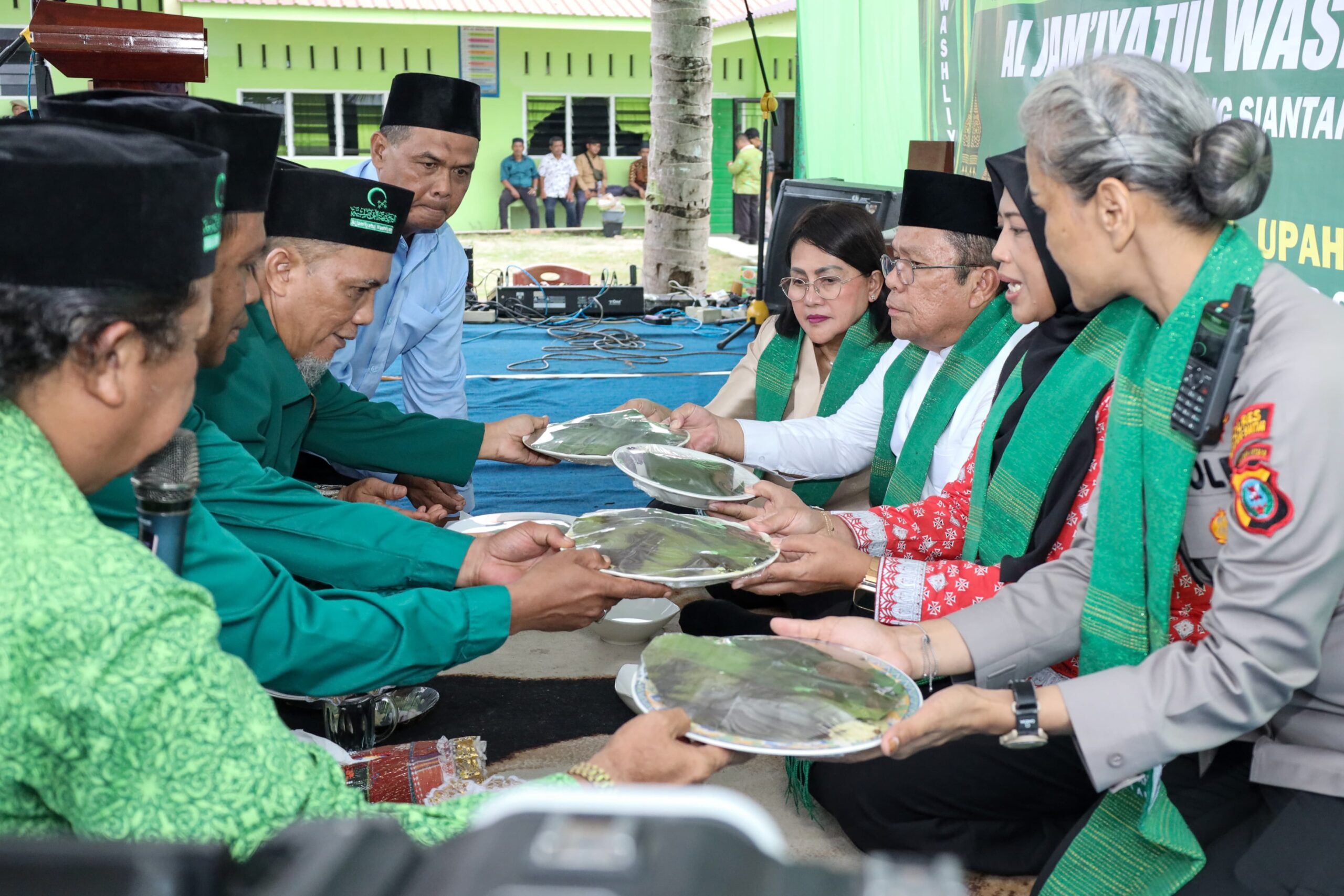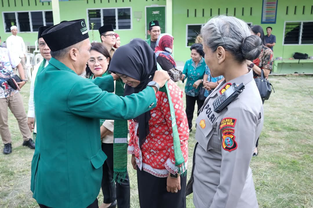 Wali Kota Pematangsiantar Wesly Silalahi SH MKn dan Ketua TP PKK Ny Liswati Wesly Silalahi bersama Wakil Wali Kota Herlina dan Kapolres AKBP Sah Udur Togi Marito Sitinjak SH SIK MH menerima upa-upa di acara Halal Bihalal Al Jam’iyatul Washliyah Kota Pematangsiantar.