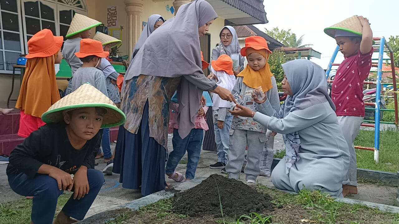 Anak didik didampingi para guru penuh semangat mulai memasukkan bibit ke polibek hingga membagikannya kepada masyarakat.