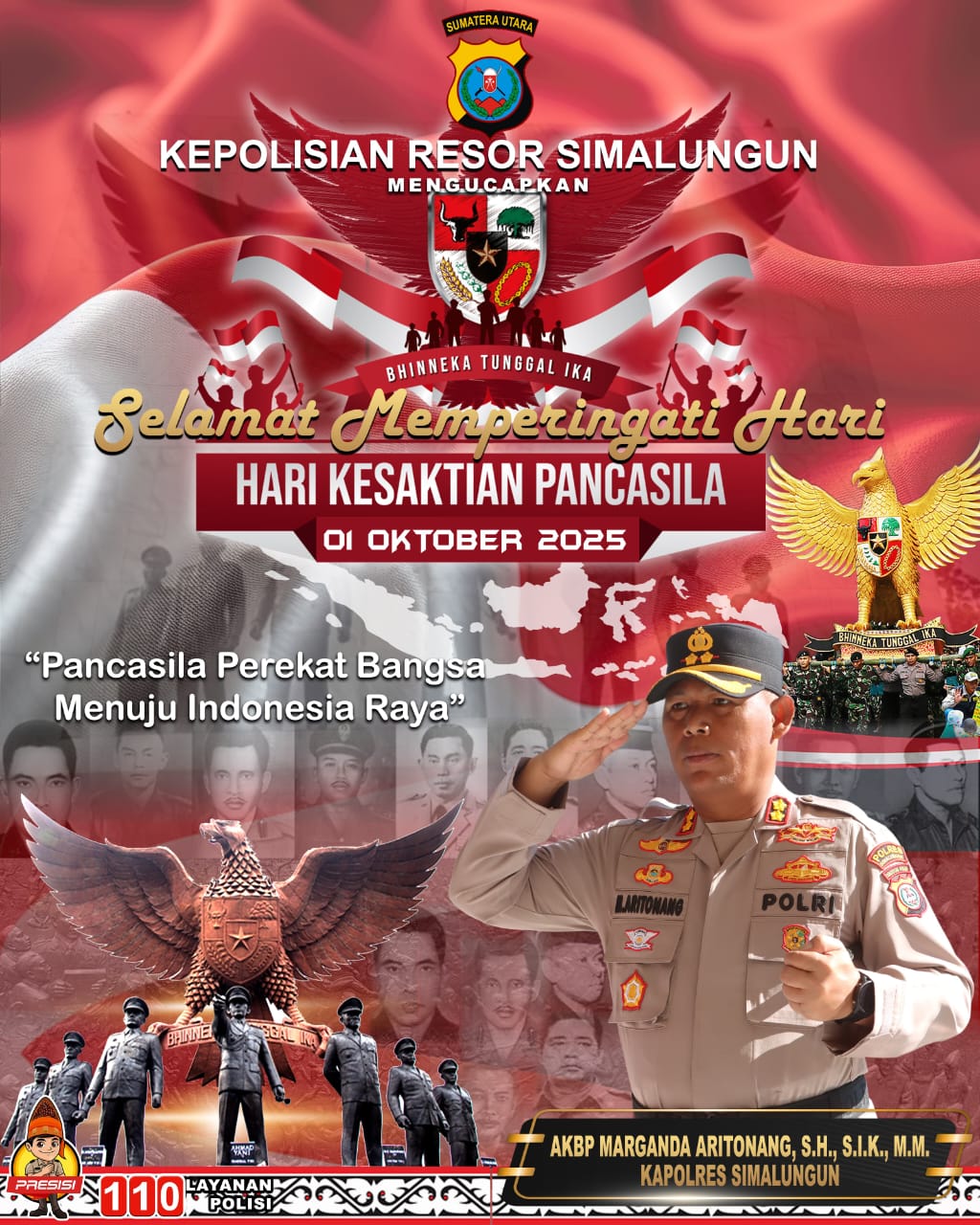 Kapolres Simalungun, AKBP Marganda Aritonang didampingi istri tercinta, Ny. Nanik M. Aritonang, menyampaikan ucapan selamat memperingati Hari Kesaktian Pancasila kepada seluruh masyarakat Indonesia, khususnya warga Kabupaten Simalungun.