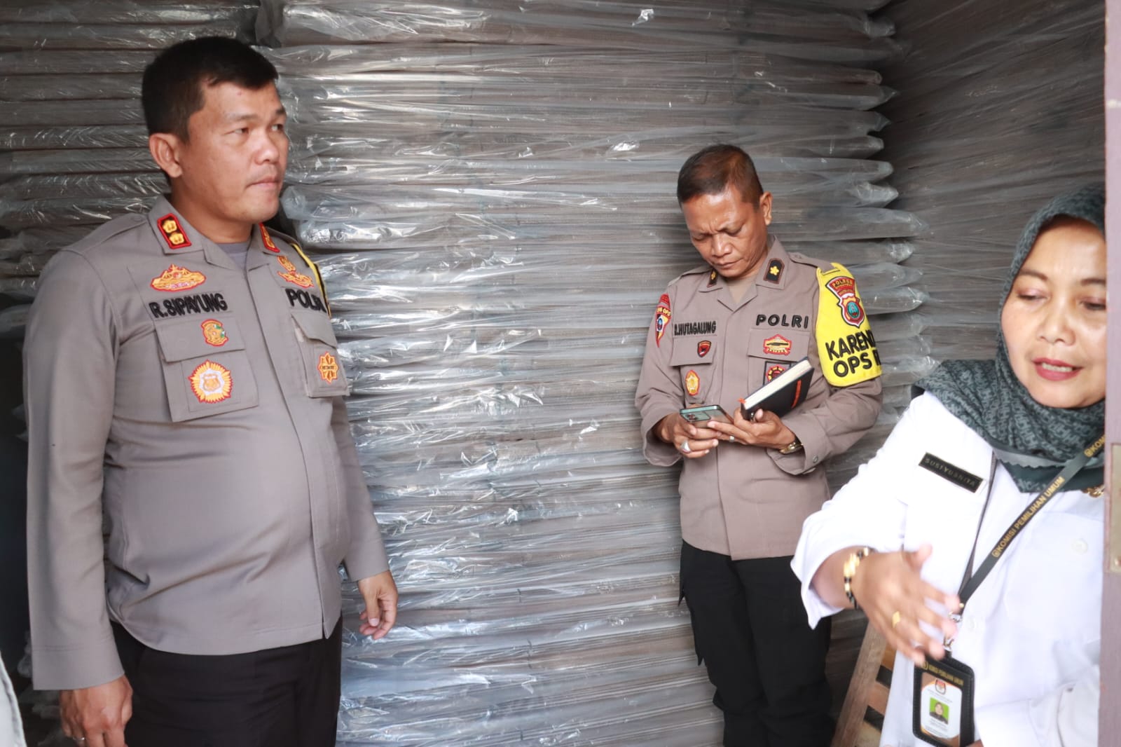 AKBP Ronald F.C Sipayung, menyampaikan pengecekan gudang logistik pemilu berisikan kotak bilik suara.