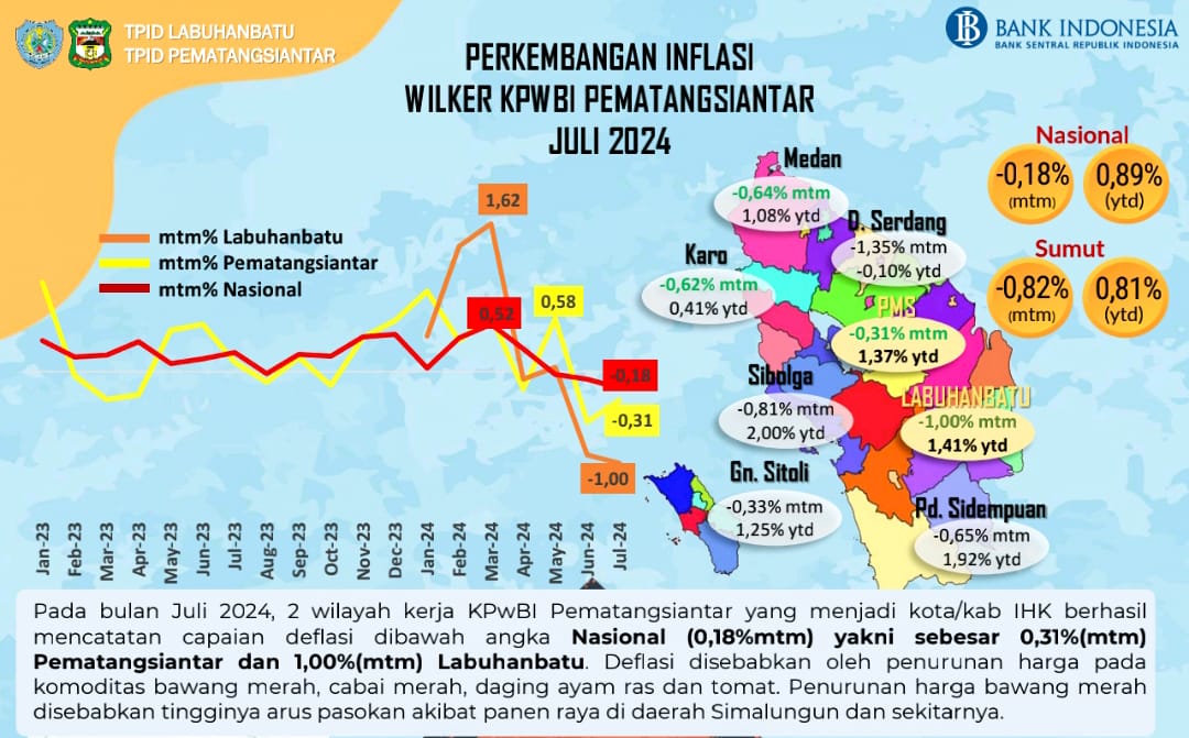 Sebelumnya, Juni 2024 Kota Pematangsiantar mengalami deflasi -0,55 persen. Kondisi ini menempatkan Kota Pematangsiantar menjadi terbaik dua di Provinsi Sumut dalam hal pengendalian inflasi, di bawah Kabupaten Labuhanbatu yang sama-sama merupakan wilayah kerja Kantor Perwakilan Bank Indonesia (KPw BI) Pematangsiantar. Atas prestasi tersebut, TPID Kota Pematangsiantar diminta memperkuat sinergi dan koordinasi, sehingga inflasi tetap terkendali.