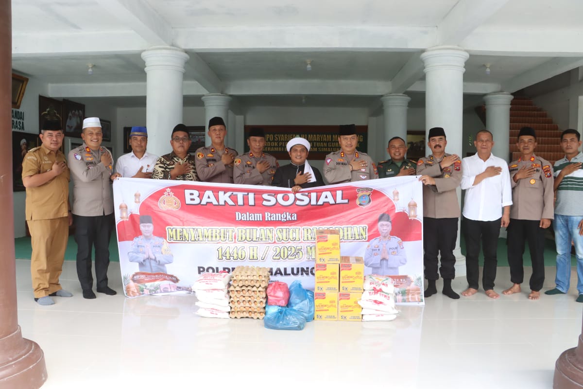 Kepala Kepolisian Resor (Kapolres) Simalungun AKBP Choky Sentosa Meliala, S.I.K., S.H., M.H. menggelar bakti sosial sekaligus silaturahmi dengan tokoh agama dalam rangka pelaksanaan Bakti Religi Polri Safari Ramadhan di Pondok Persulukan Serambi Babussalam Simalungun Al-Arif Billah Syekh Abdurrahman Rajaguguk Al Khaliy Naqsyabandi Qs, pada Senin (10/3/2025).