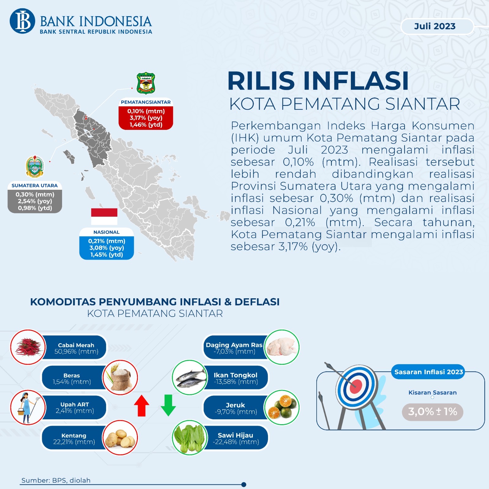 Realisasi tersebut lebih rendah dibandingkan realisasi Provinsi Sumatera Utara yang mengalami inflasi sebesar 0,30% (mtm) dan realisasi inflasi Nasional yang mengalami inflasi sebesar 0,21% (mtm). Secara tahunan, Kota Pematang Siantar mengalami inflasi sebesar 3,17% (yoy).