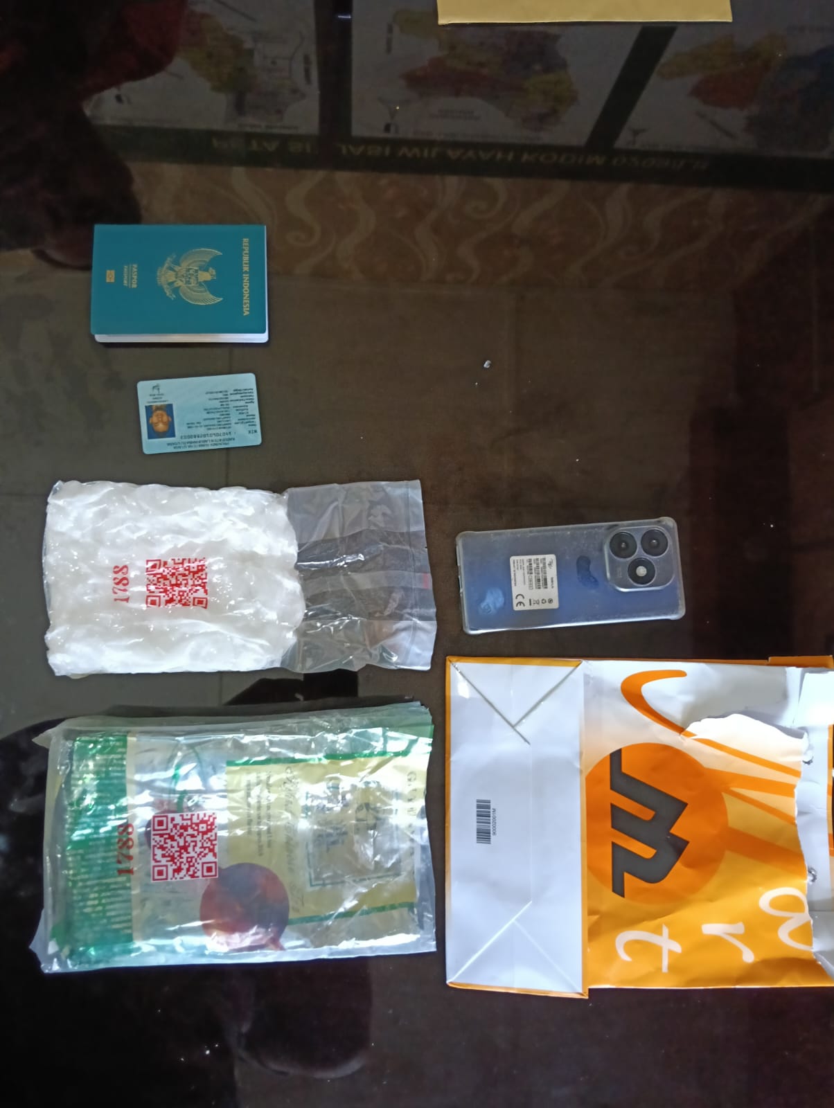 Setelah dilakukan penggeledahan, narkotika jenis sabu dengan merek “Guan Yin Wang” ditemukan di dalam sebuah tas berwarna oranye, bersama dengan sejumlah barang bukti lainnya, termasuk paspor, KTP, boarding pass, dan telepon genggam.