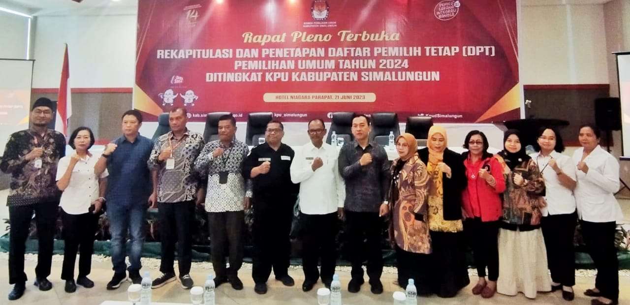 Komisi Pemilihan Umum (KPU) Kabupaten Simalungun menggelar Rapat Pleno Terbuka Rekapitulasi dan Penetapan Daftar Pemilih Tetap (DPT) Pemilihan Umum (Pemilu) 2024 di Hotel Niagara Parapat, Kecamatan Girsang Sipangan Bolon, Simalungun,Sumut, Rabu (21/06/2023).