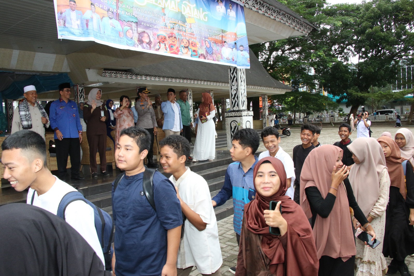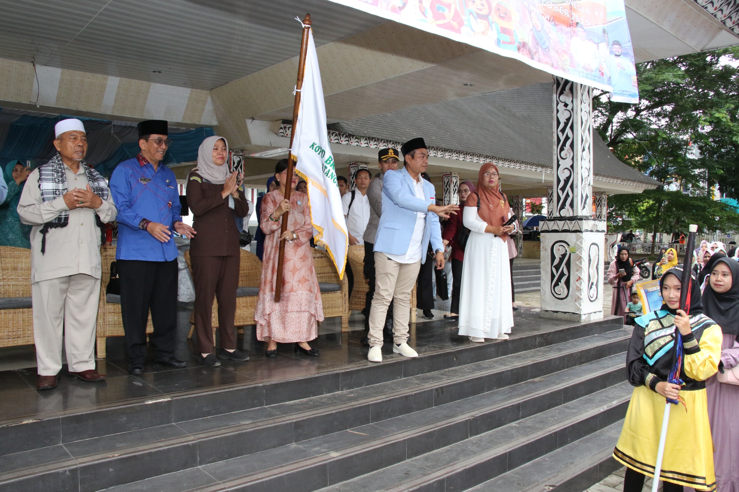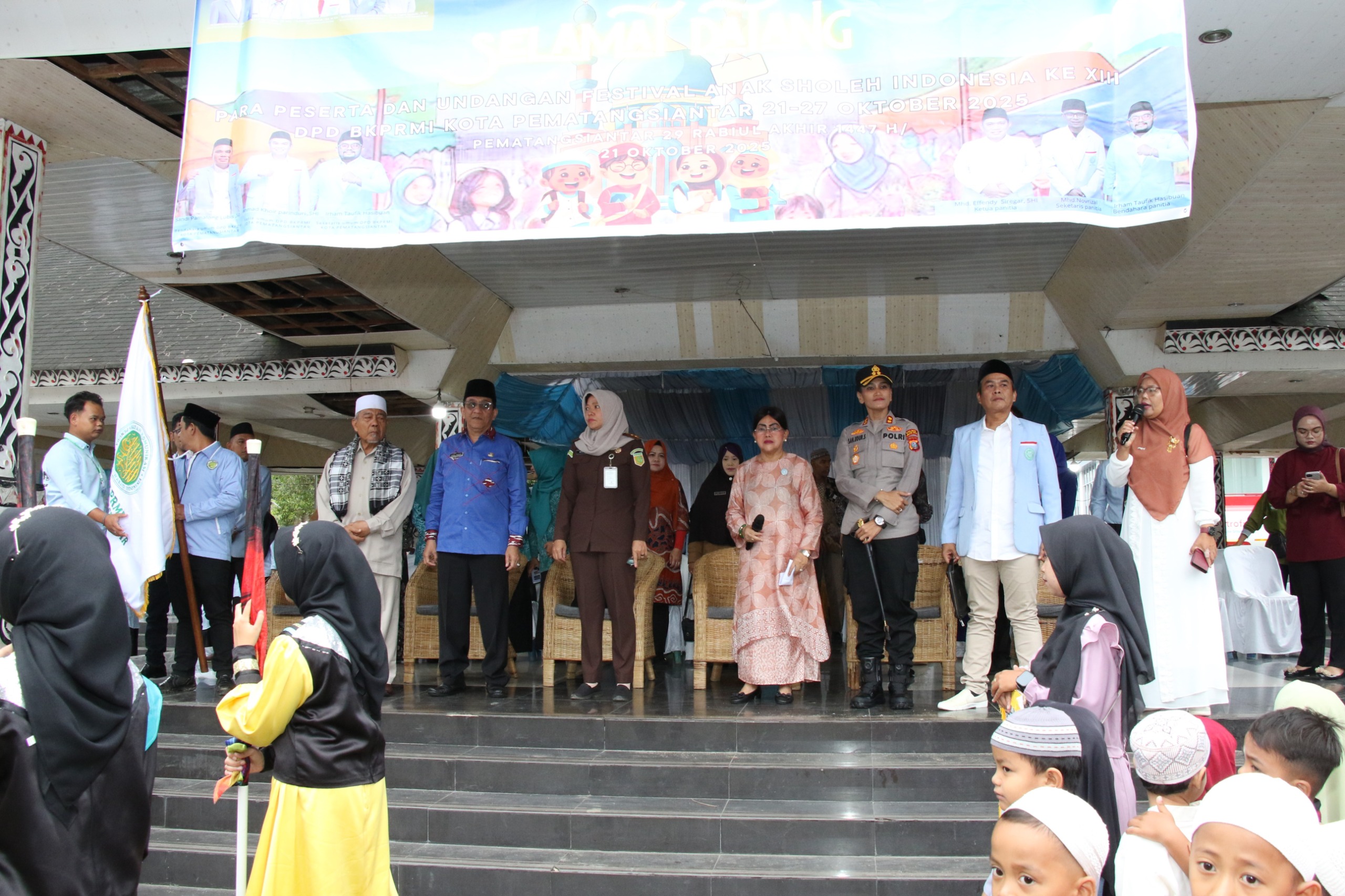 Ketua TP PKK Kota Pematangsiantar Ny Liswati Wesly Silalahi melepas peserta Pawai Ta’aruf Festival Anak Sholeh Indonesia (FASI) ke XIII Badan Komunikasi Pemuda dan Remaja Masjid Indonesia (BKPRMI) Kota Pematangsiantar Tahun 2025. Pelepasan dilakukan di Lapangan Adam Malik, Selasa (21/10/2025).