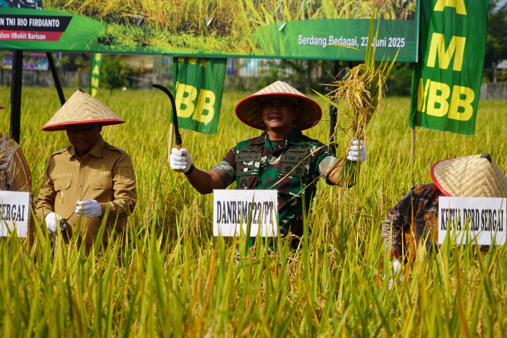 Pangdam I/Bukit Barisan Mayjen TNI Rio Ferdianto bersama Danrem 022/Pantai Timur Kolonel Inf Agus Supriyono, S.E., M.Han., melaksanakan panen raya padi “Sinar Mentari” di Desa Kota Galuh, Kecamatan Perbaungan, Kabupaten Serdang Bedagai, Senin (23/6/2025).