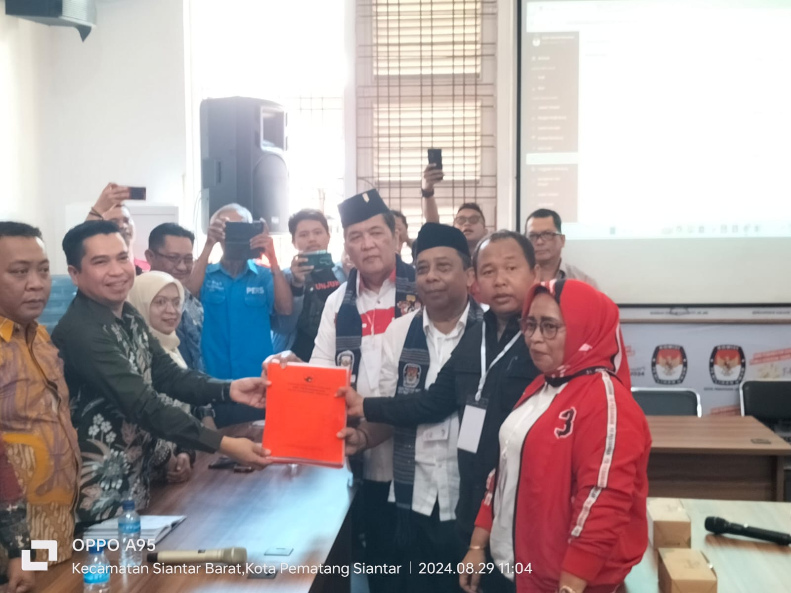 Pasangan calon (Paslon) Walikota/Wakil Walikota Pematangsiantar Yan Santoso Purba (Abang Ganteng) dan H Irwan yang diusung PDI Perjuangan (PDI-P) resmi mendaftar ke KPUD Kota Pematangsiantar, Kamis (29/8/2024).