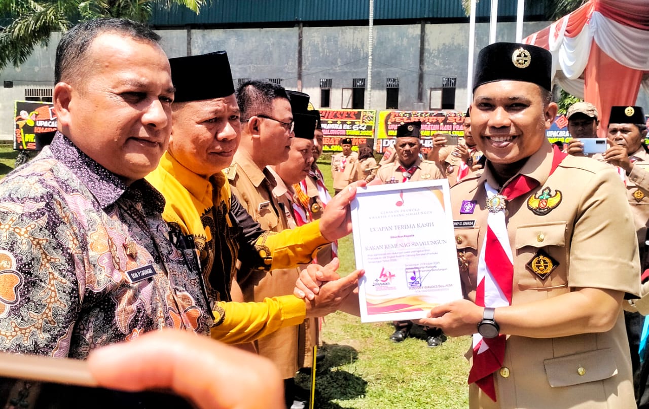 Upacara yang mengusung tema “Kolaborasi untuk membangun ketahanan bangsa bersama Semangat Baru Simalungun Maju” ini juga diisi dengan penyematan tanda penghargaan Gerakan Pramuka berupa Lencana Pancawarsa kepada orang dewasa, serta penyematan tanda peserta Kemah Besar Hari Pramuka ke-64.
