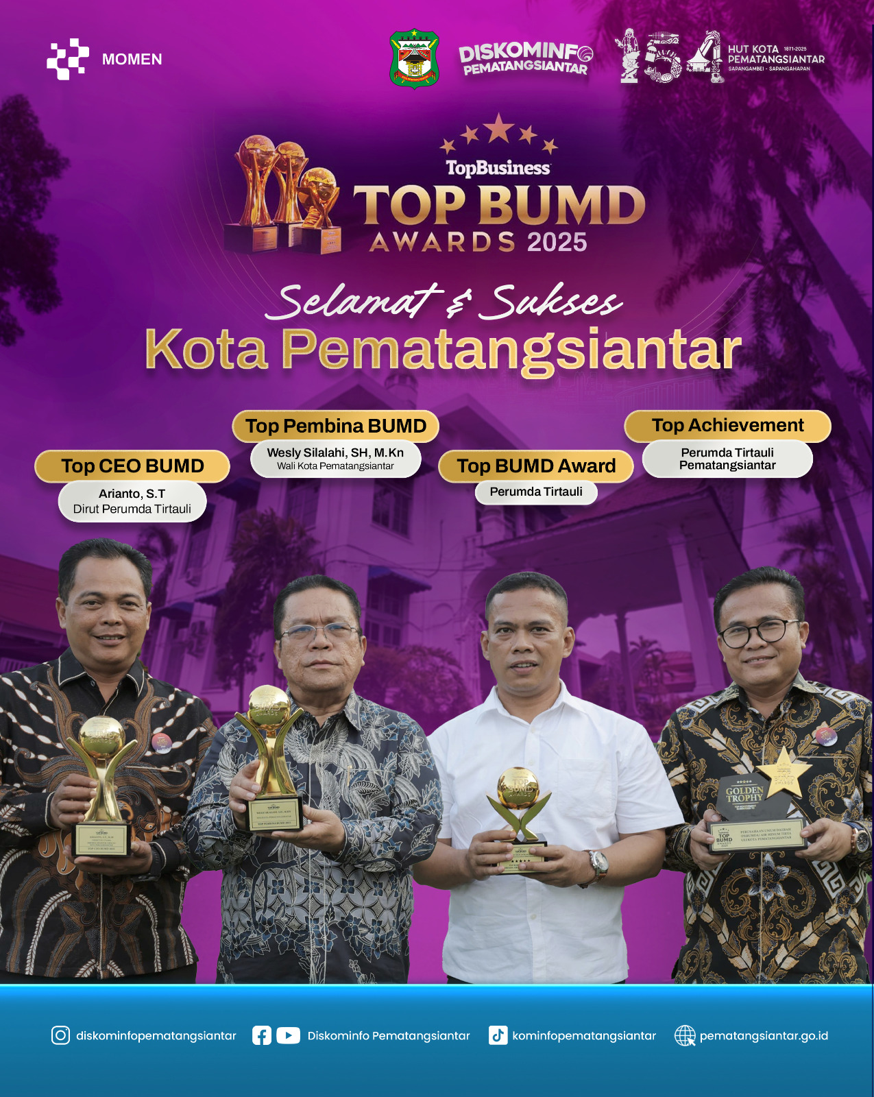 Keempat penghargaan tersebut yakni: Golden Trophy TOP BUMD Awards 2025; TOP BUMD Awards 2025 Perumda Air Minum Bintang 5: TOP CEO BUMD 2025 yaitu Direktur Utama (Dirut) Perumda Air Minum Tirta Uli Arianto ST MM; serta TOP Pembina BUMD 2025 bagi Wali Kota Pematangsiantar Wesly Silalahi SH MKn.