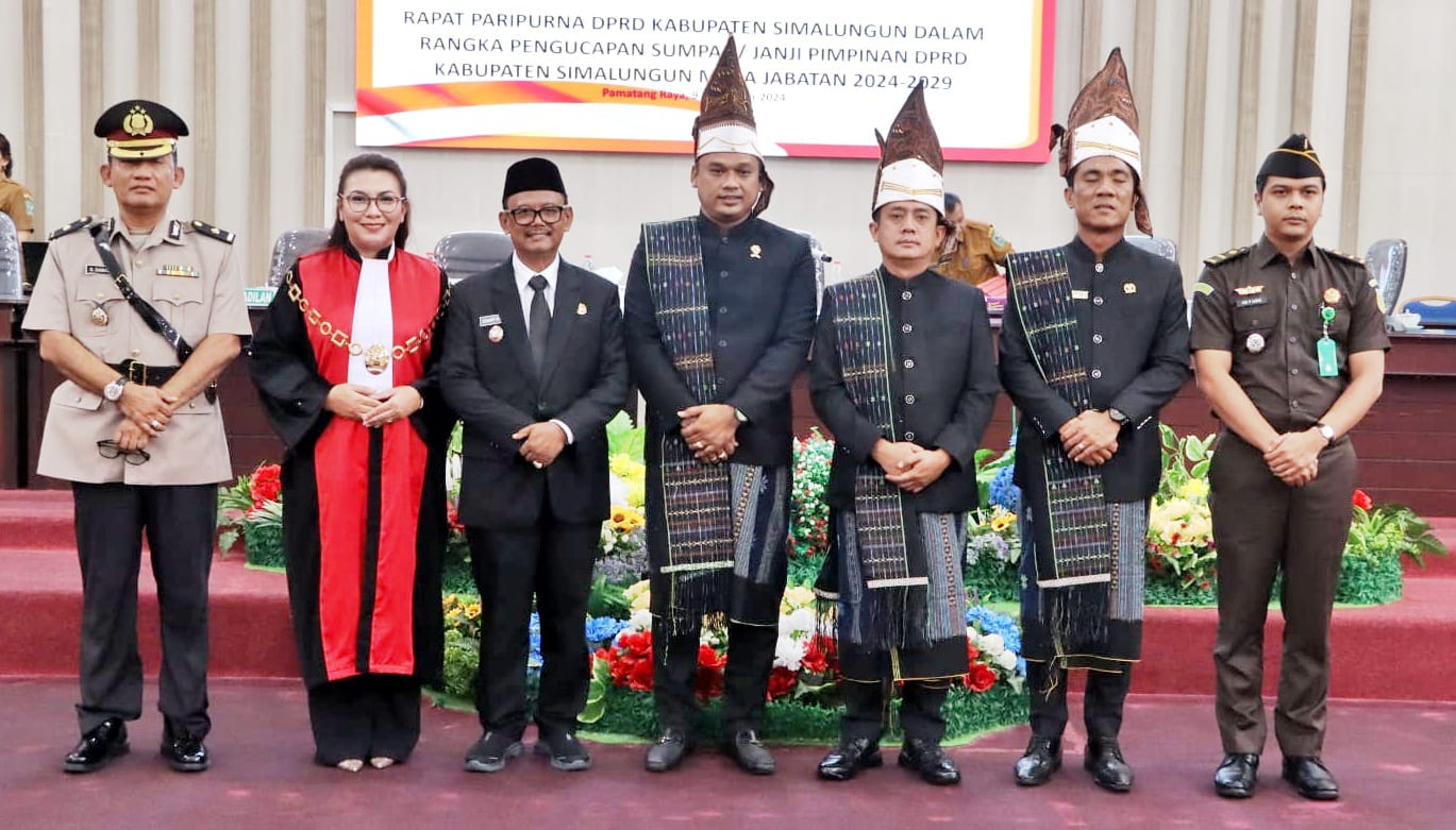 Pimpinan Dewan Perwakilan Rakyat Daerah (DPRD) Kabupaten Simalungun periode 2024-2029 memgucapkan sumpah/janji dipimpin oleh Ketua Pengadilan Negeri Simalungun Erika Sari Emsah Ginting.