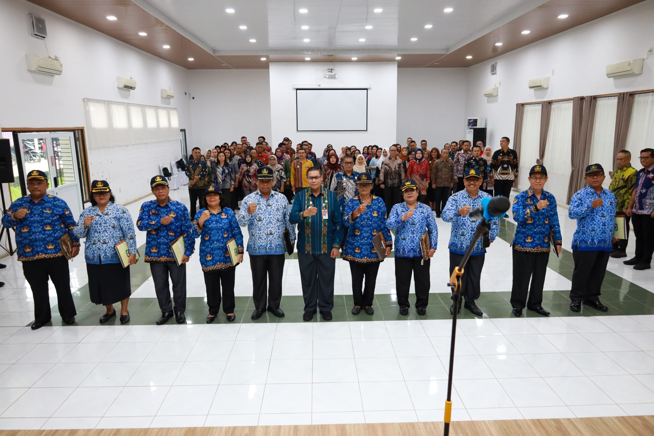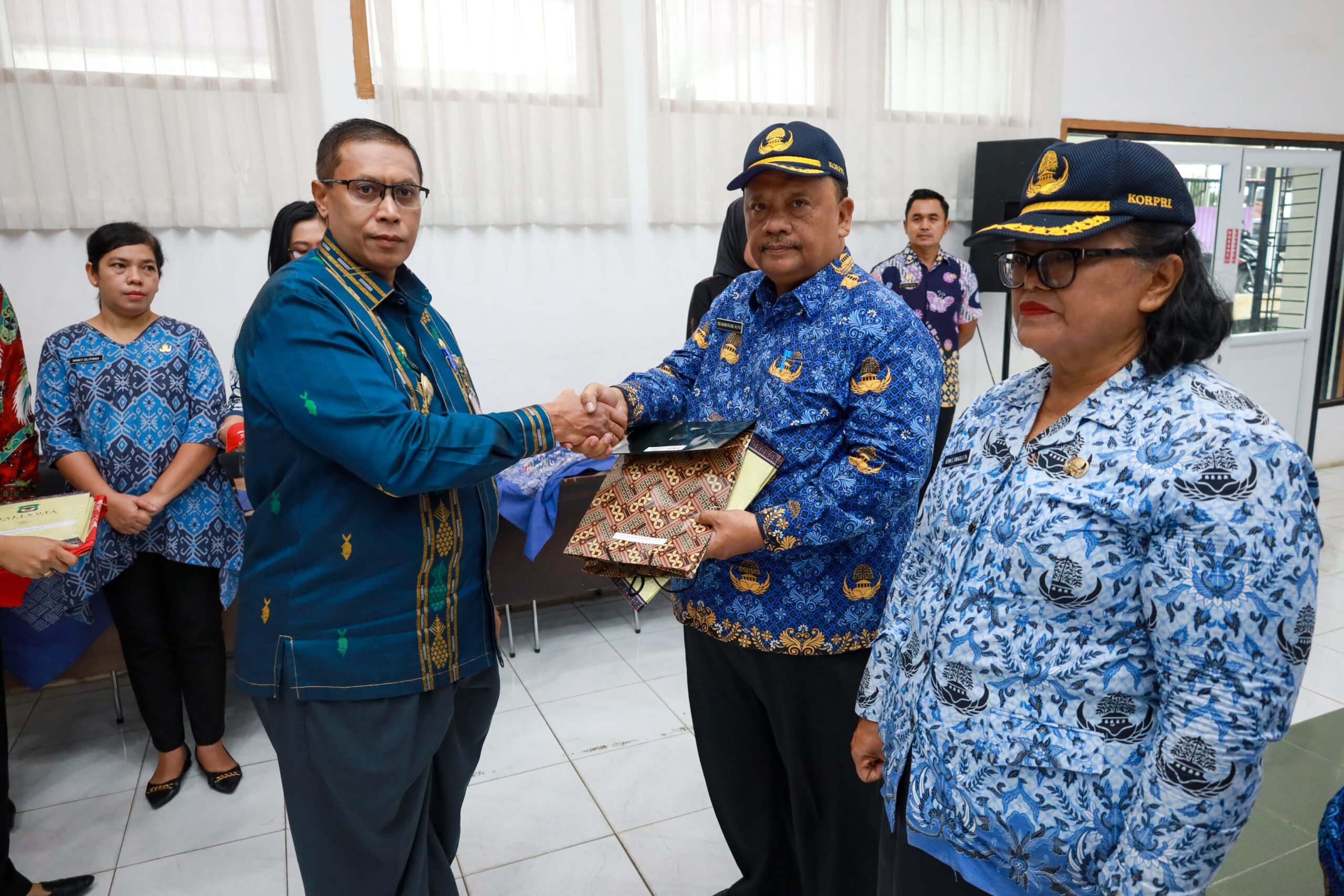 Matheos Tan melepaskan pin Korpri serta menyerahkan SK Pensiun dan suvenir kepada para PNS purnabakti.
