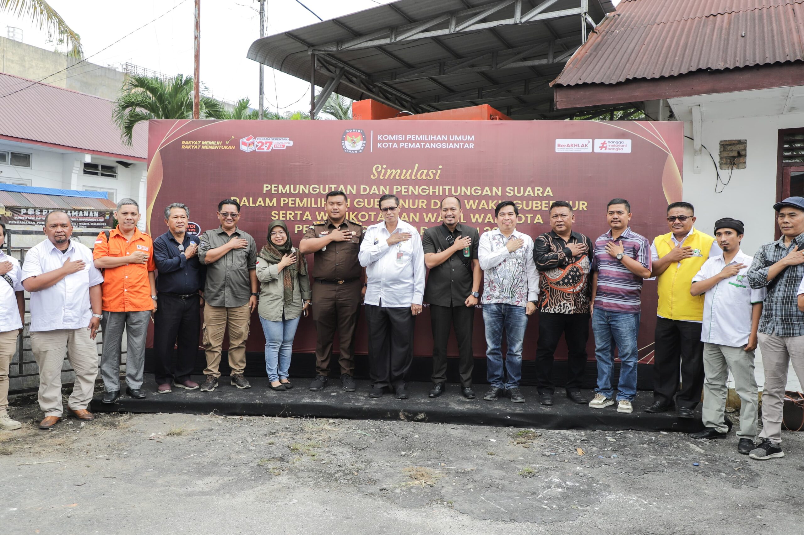Penjabat Sementara (Pjs) Wali Kota Pematangsiantar Drs Matheos Tan MM turut serta dalam simulasi Pemungutan Suara Pemilihan Gubernur dan Wakil Gubernur serta Wali Kota dan Wakil Wali Kota Pematangsiantar Tahun 2024.