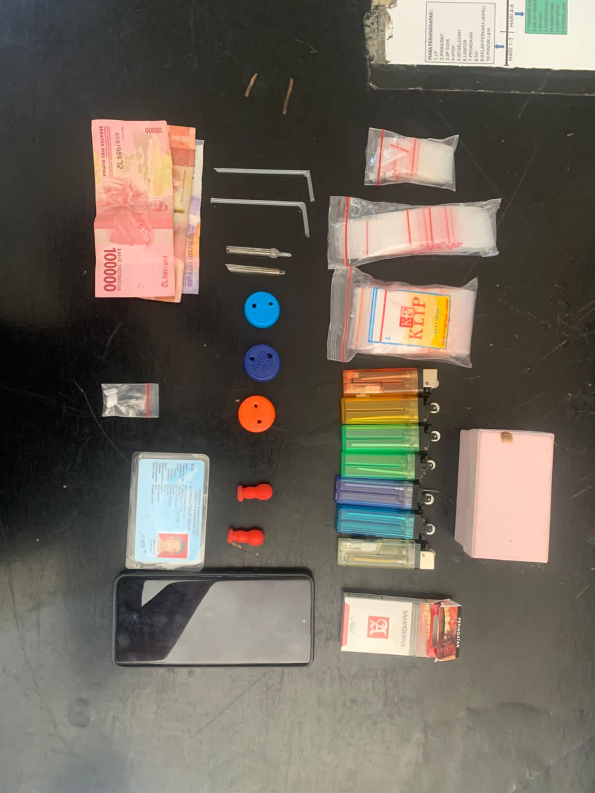 Petugas juga mengamankan satu unit handphone Android merek Oppo warna hitam yang diduga digunakan sebagai alat komunikasi dengan jaringan, uang tunai hasil penjualan sebesar Rp210.000, satu buah kotak rokok Sempurna, dua buah pipet plastik, tiga buah tutup botol Aqua, dua buah kompensasi berwarna merah, satu buah kotak berwarna merah jambu, satu buah tas dompet bercorak bunga, dan satu buah KTP milik tersangka.