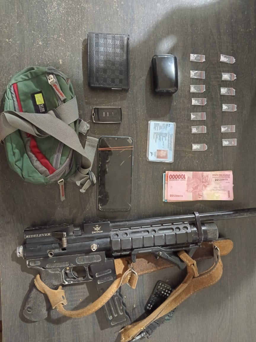 Selain narkoba, petugas juga menyita satu pucuk senjata api jenis senapan angin merek Selesever warna hitam, satu buah timbangan digital, satu unit handphone merek Vivo warna biru, uang tunai sebesar Rp 850.000, satu buah jam tangan hitam, satu buah KTP atas nama tersangka, dan satu plastik klip sedang kosong.