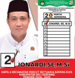 Jonardi,SE,MSi yang akrab disapa Bang Jonardi bakal maju bertarung pada pencalonan Legislatif DPRD Deli Serdang pada 2024 mendatang dengan no urut 2 dari Partai Gerindra Dapil VI, Kecamatan Batangkuis dan Kecamatan Percut Sei Tuan.