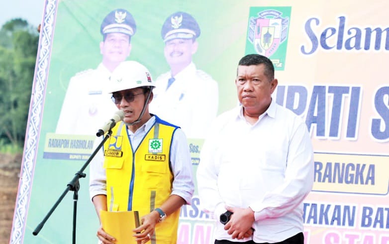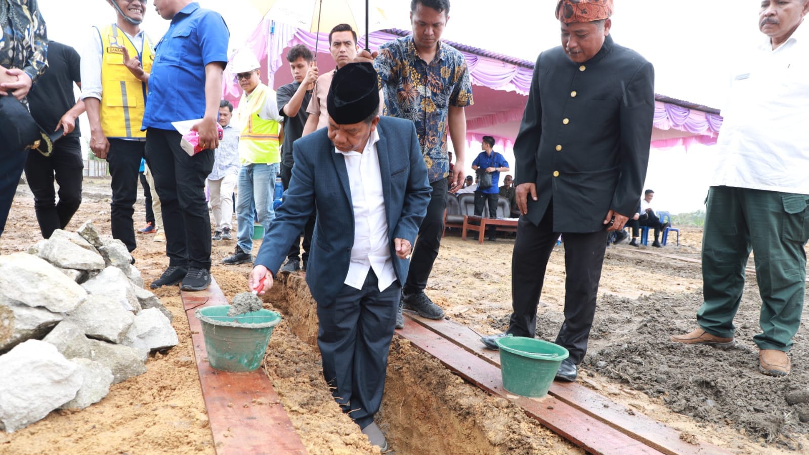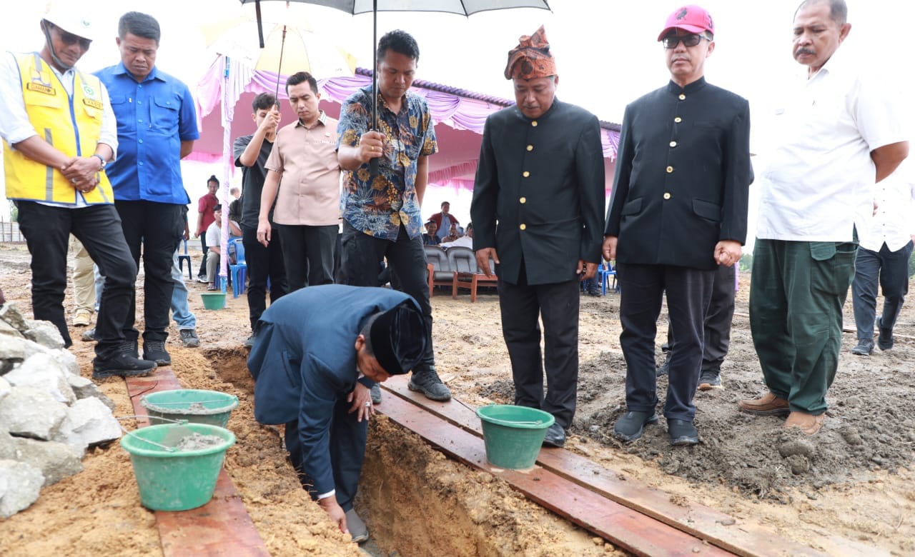 Bupati Simalungun Radiapoh Hasiholan Sinaga (RHS) melakukan peletakan batu pertama pembangunan Stadion Mini di Ibukota Kabupaten Simalungun, Pamatang Raya, Kecamatan Raya, Sumut, Jum’at (13/9/2024).
