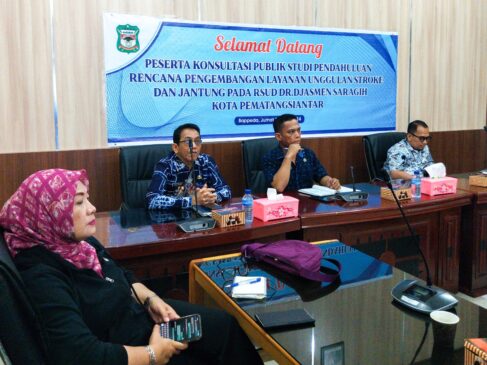 Wali Kota Pematangsiantar dr Susanti Dewayani SpA diwakili Pj Sekretaris Daerah (Sekda) Junaedi Antonius Sitanggang SSTP MSi menghadiri Konsultasi Publik Rencana Proyek Investasi Pengembangan Rumah Sakit Umum Daerah (RSUD) dr Djasamen Saragih menjadi Pusat Layanan Stroke dan Jantung di Kota Pematangsiantar.