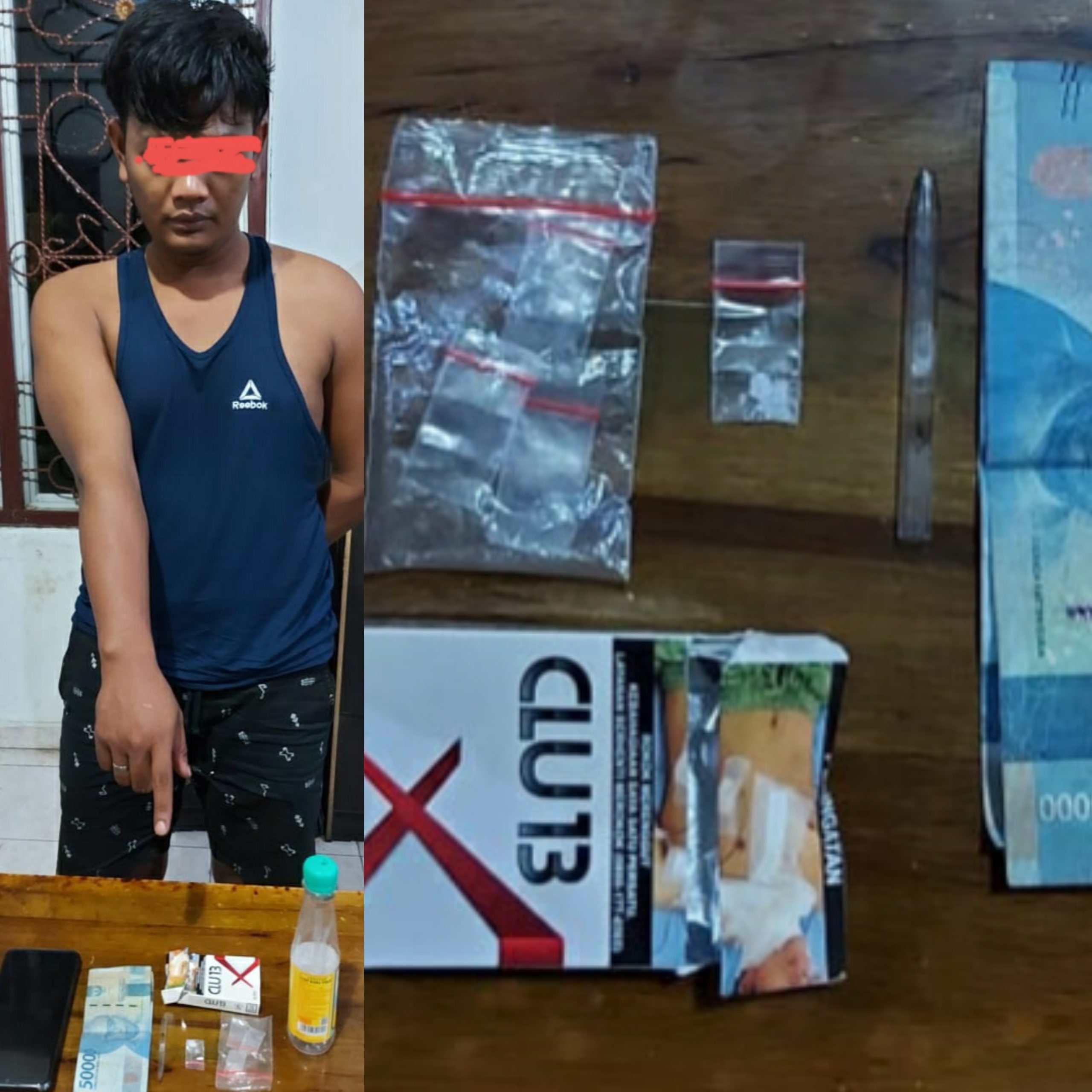 Selanjutnya Tim melakukan penggeledahan badan dan berhasil menemukan barang bukti berupa 1 (satu) Bungkus Plastik Klip Transparan yang didalamnya berisi diduga narkotika jenis sabu-sabu dengan berat brutto 0,15 gram, 1 (satu) kaca pirex yang didalamnya berisi diduga narkotika jenis sabu-sabu dengan berat bruto 1,23 gram, 1 (satu) bungkus rokok merk Club Mild, 1 (satu) plastik klip sedang yang di dalamnya terdapat 3 (tiga) plastik klip kecil kosong, 1 (satu) unit HP android merk Vivo, 1 (satu) set bong / alat hisap sabu-sabu dan Uang sejumlah Rp. 100.000,-