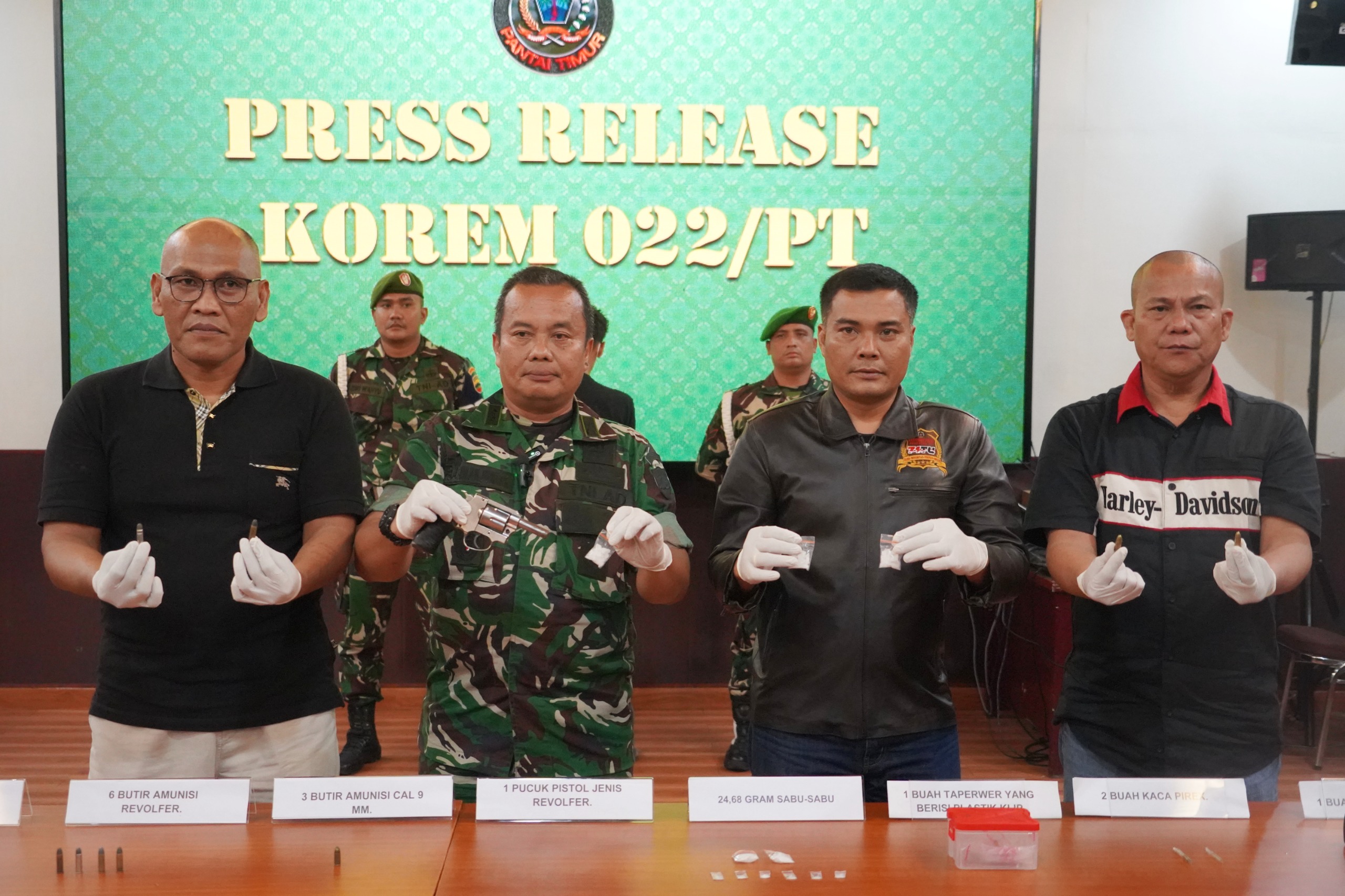 Penangkapan tersebut, petugas berhasil mengamankan sejumlah barang bukti, antara lain: 1 pucuk pistol revolver, 3 butir peluru kaliber 9 mm, 6 butir amunisi revolver, narkotika jenis sabu-sabu seberat 22,68 gram, uang tunai sebesar Rp 2.170.000, 1 unit HP merk Realme, 1 buah tas pinggang, 2 buah kaca pirex, 2 buah pipet, serta 1 buah tapperwer berisi plastik klip.