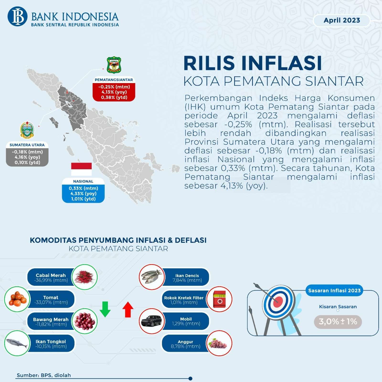 Dalam upaya untuk mengendalikan Inflasi di bulan April 2023, TPID Kab/Kota di Wilayah Kerja KPwBI Pematang Siantar telah melaksanakan beberapa program, Monitoring harga komoditas secara harian melalui PIHPS maupun harga Diskoperindag, Sidak pasar dipimpin oleh Kepala Daerah Bersama Forkopimda di Kota Pematang Siantar, Pelaksanaan Pasar Murah di Kota Pematang Siantar (5 hari, 8 titik), Pelaksanaan HLM TPID se-wilayah kerja Kantor Perwakilan Bank Indonesia Pematang Siantar 5 April 2023 yang dihadiri oleh TPID 8 Kab/Kota, Kepala Biro Perekonomian Sumut, Direktur Bapanas, dan Guru Besar IPB. (iw)