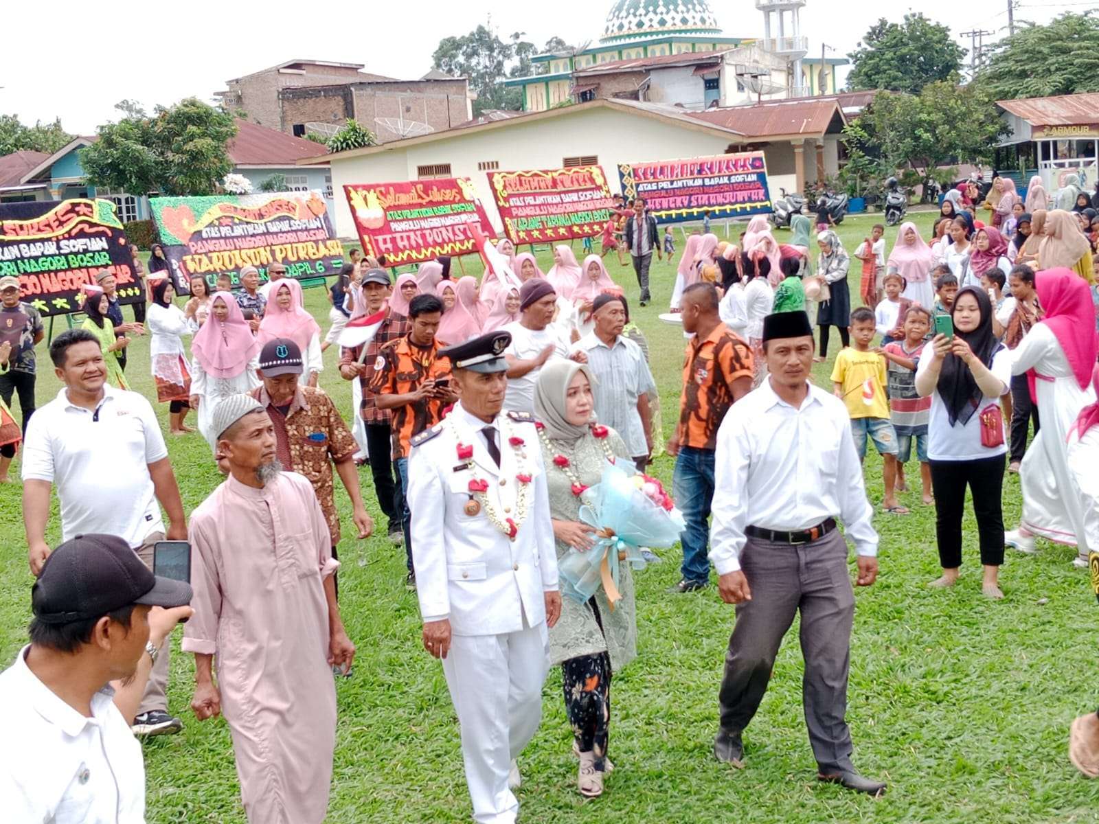 Pangulu incumbent itu didampingi istri disambut warga yang sudah menunggu di Lapangan Bola Nagori Bosar. Sofian diberi kalungan bunga oleh masyarakat dan didoakan bersama.