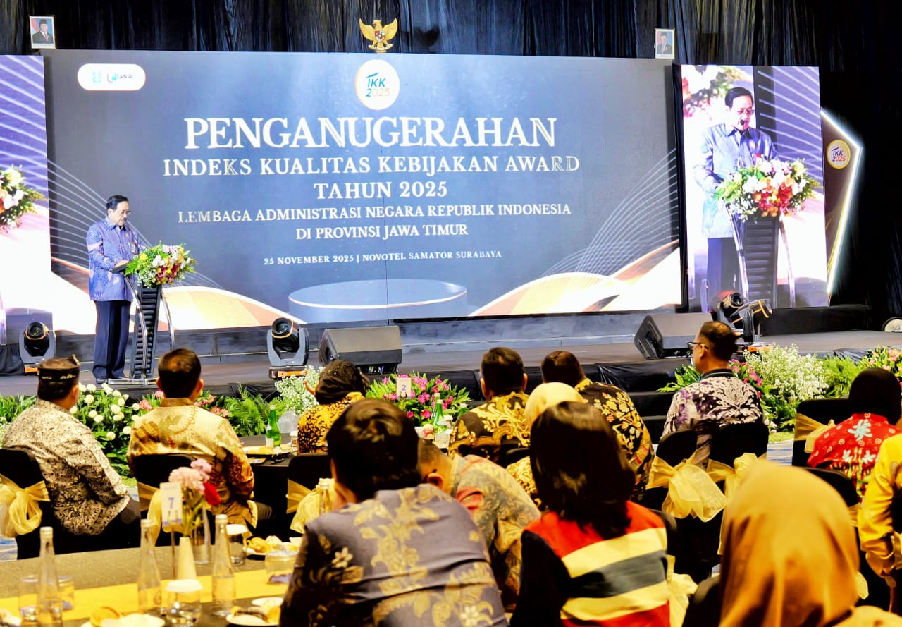 Penghargaan IKK Award 2025 diserahkan langsung oleh Kepala LAN RI Muhammad Taufiq kepada pemerintah daerah yang dinilai memiliki kualitas kebijakan unggul, efektif, dan mampu mendorong peningkatan mutu pelayanan publik.