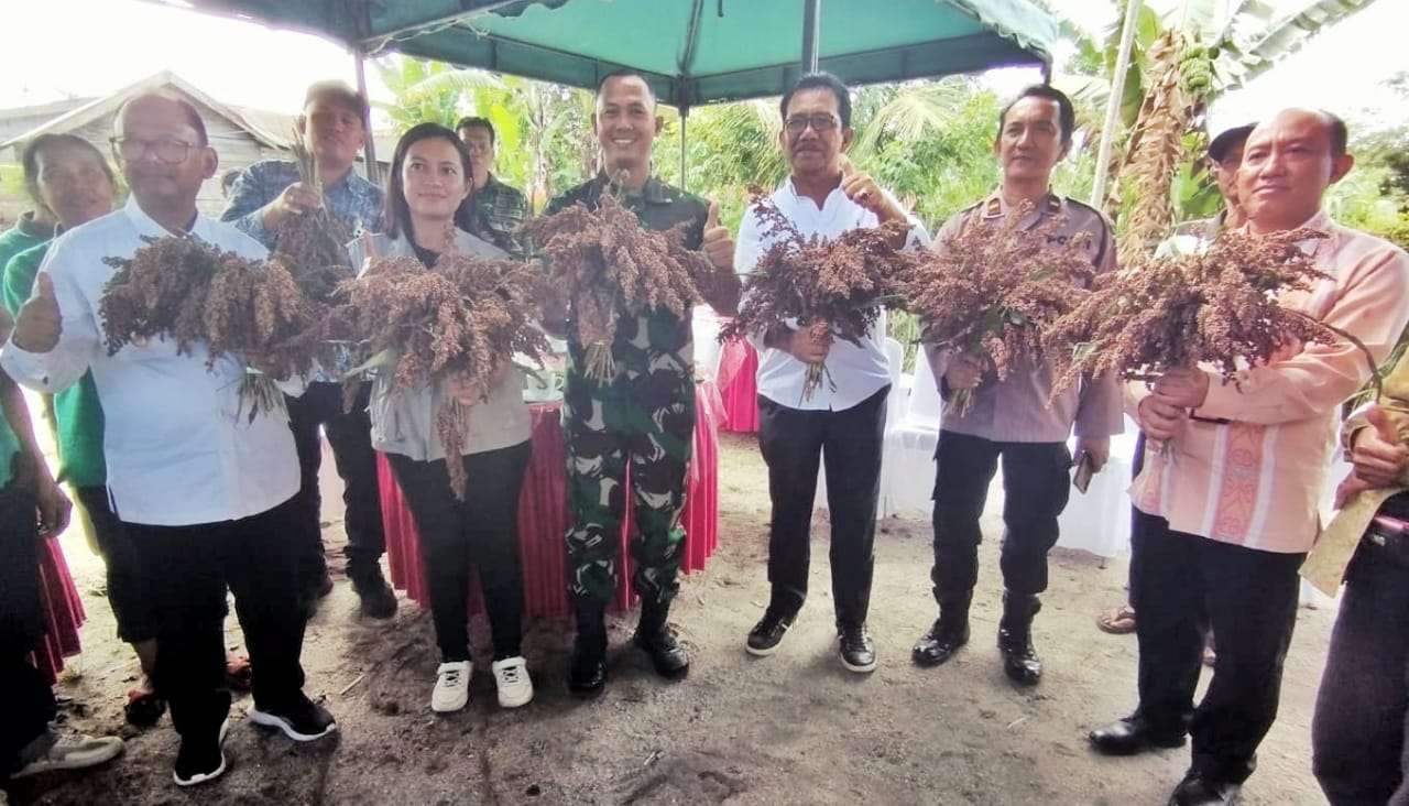 Bupati Simalungun di wakili Wakil Bupati H Zonny Waldi melakukan panen perdana tanaman sorgum, pembinaan ketahanan pangan Tahun 2023 Kodim 0207/Sml, di Simpang Tangaran Logou, Kelurahan Merek Raya, Kecamatan Raya, Simalungun, Sumut, Jumat (16/06/2023).