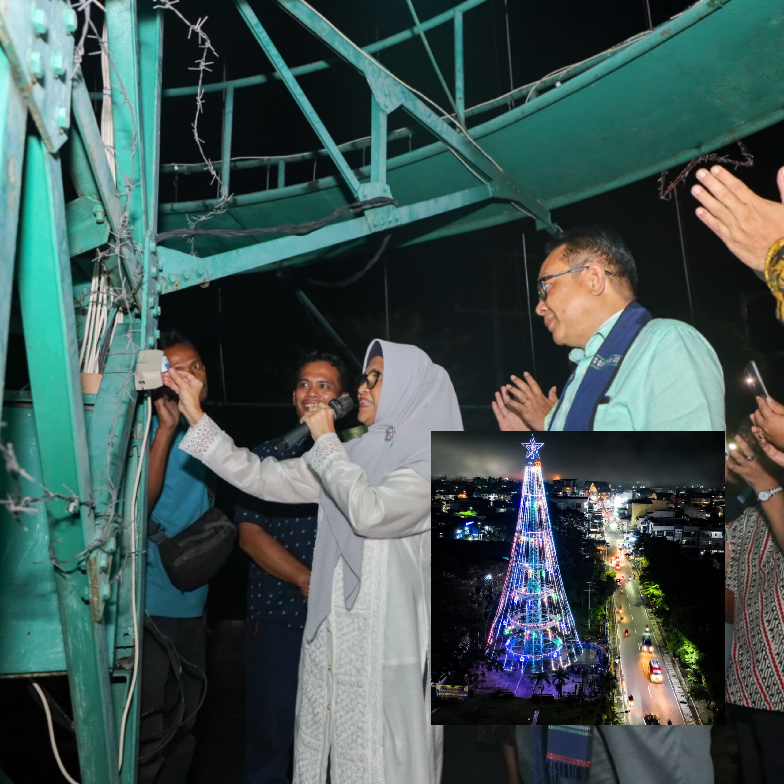 Wali Kota Pematang Siantar dr Susanti Dewayani SpA bersama Ketua Umum Panitia Natal Oikumene Kota Pematang Siantar Astronout Nainggolan menyalakan Pohon Terang, di Jalan Gereja, Jumat (01/12/2023) sekitar pukul 18.00 WIB.