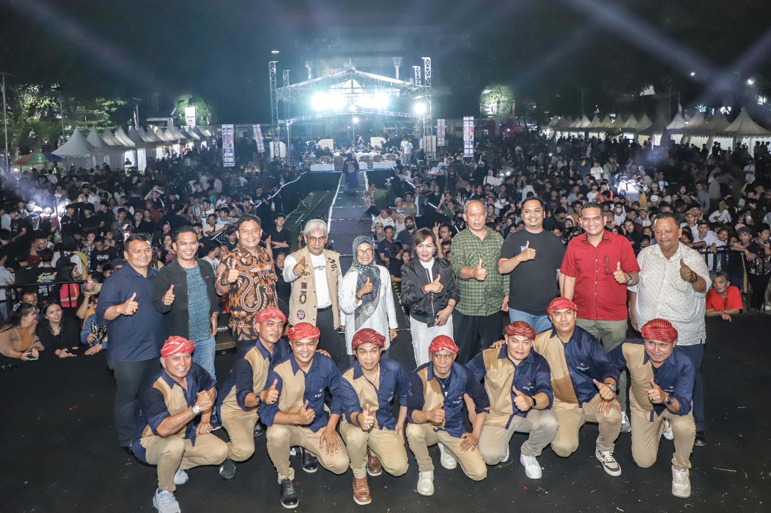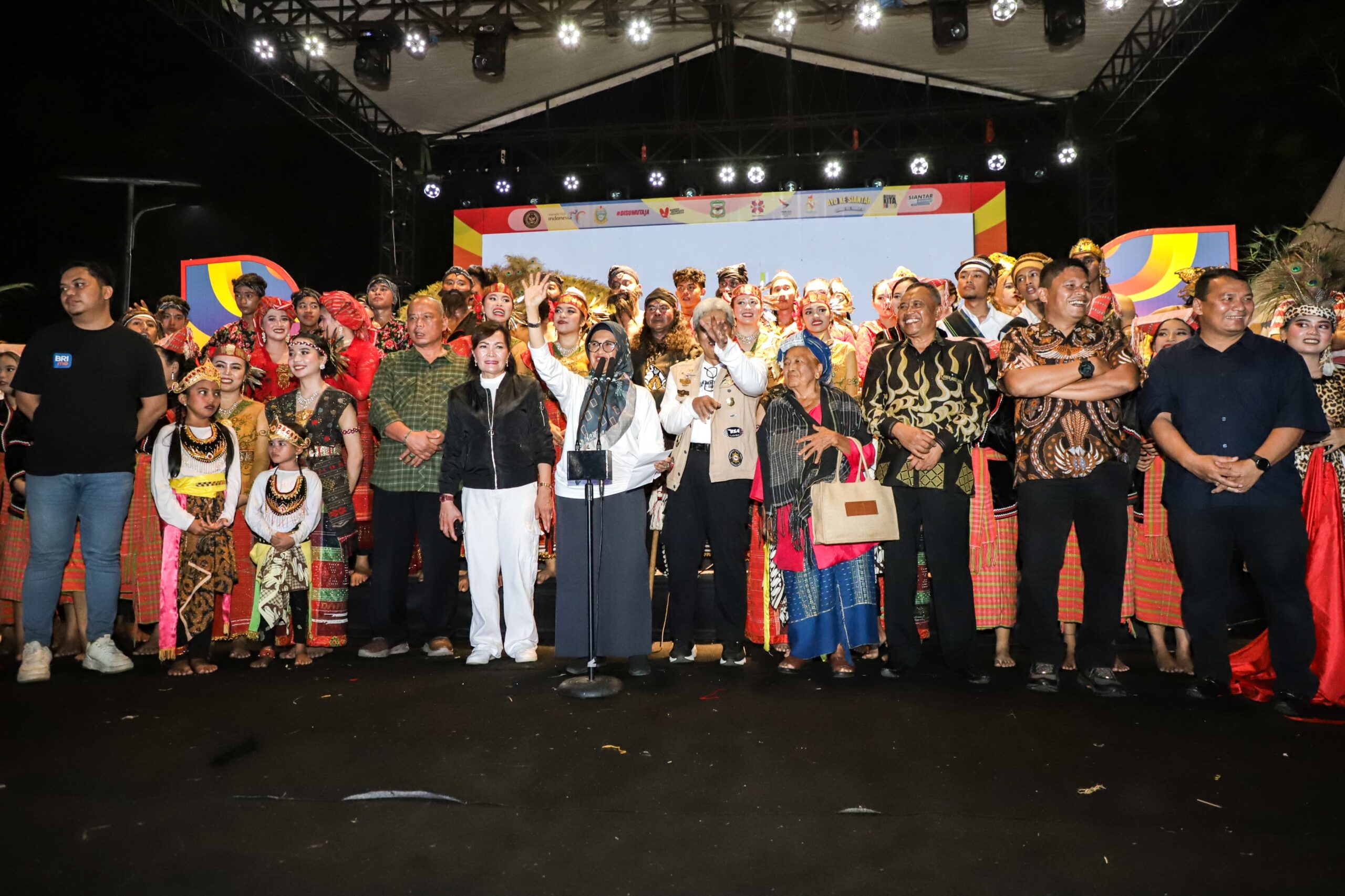 Wali Kota Pematangsiantar dr Susanti Dewayani SpA didampingi Ketua Dekranasda H Kusma Erizal Ginting SH bersama unsur Forkopimda dan Op Raminah br Garingging Maestro Seni Tradisi serta ribuan masyarakat menyaksikan Puncak Siantar Culture Show ke-2, di Lapangan Adam Malik, Sabtu (13/07/2024) malam.