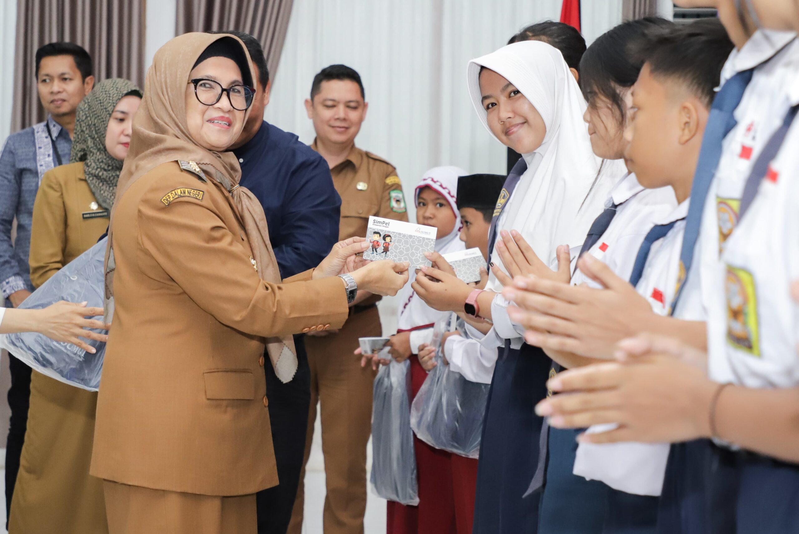 Wali Kota Pematangsiantar dr Susanti Dewayani SpA membagikan secara simbolis buku Tabungan kepada siswa-siswi SD dan SMP.
