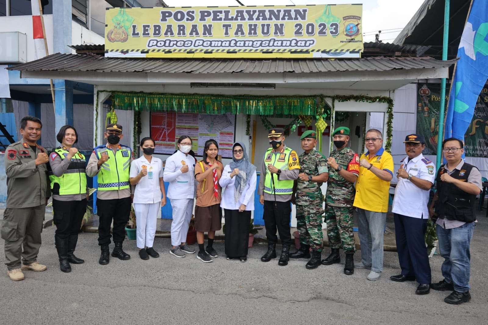 Usai meresmikan penempatan angkutan di Terminal Tipe A Tanjung Pinggir, Wali Kota Pematang Siantar dr Susanti Dewayani SpA bersama Forkopimda meninjau melakukan Pos Pengamanan (Pospam) Hari Raya Idul Fitri 1444 Hijriah. Saat meninjau, dr Susanti dan Forkopimda menyapa dan memberikan bingkisan kepada petugas Pospam.