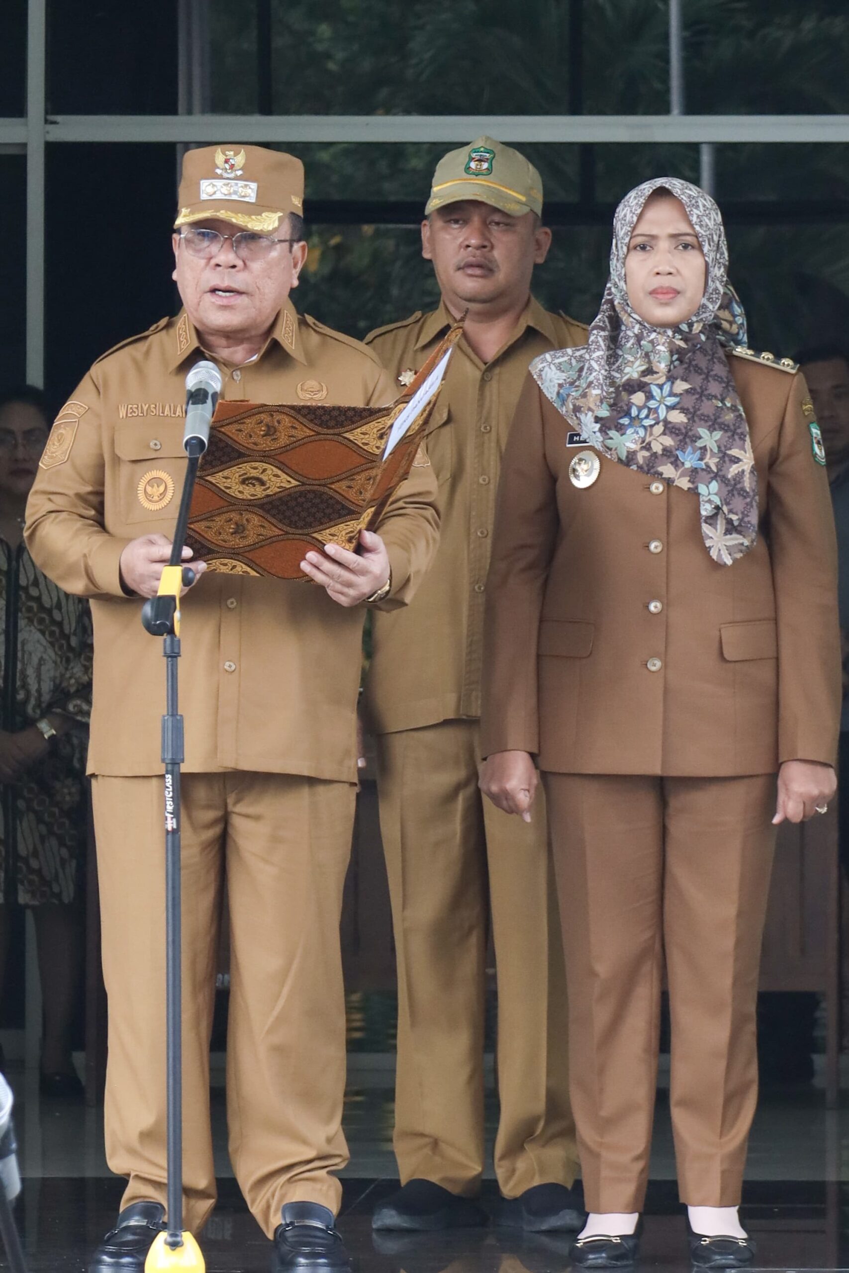 Wali Kota Pematangsiantar Wesly Silalahi SH MKn untuk kali pertama memimpin apel gabungan di jajaran Pemerintah Kota (Pemko) Pematangsiantar. Apel berlangsung di halaman Balai Kota, Jalan Merdeka, Selasa (04/03/2025) pagi.