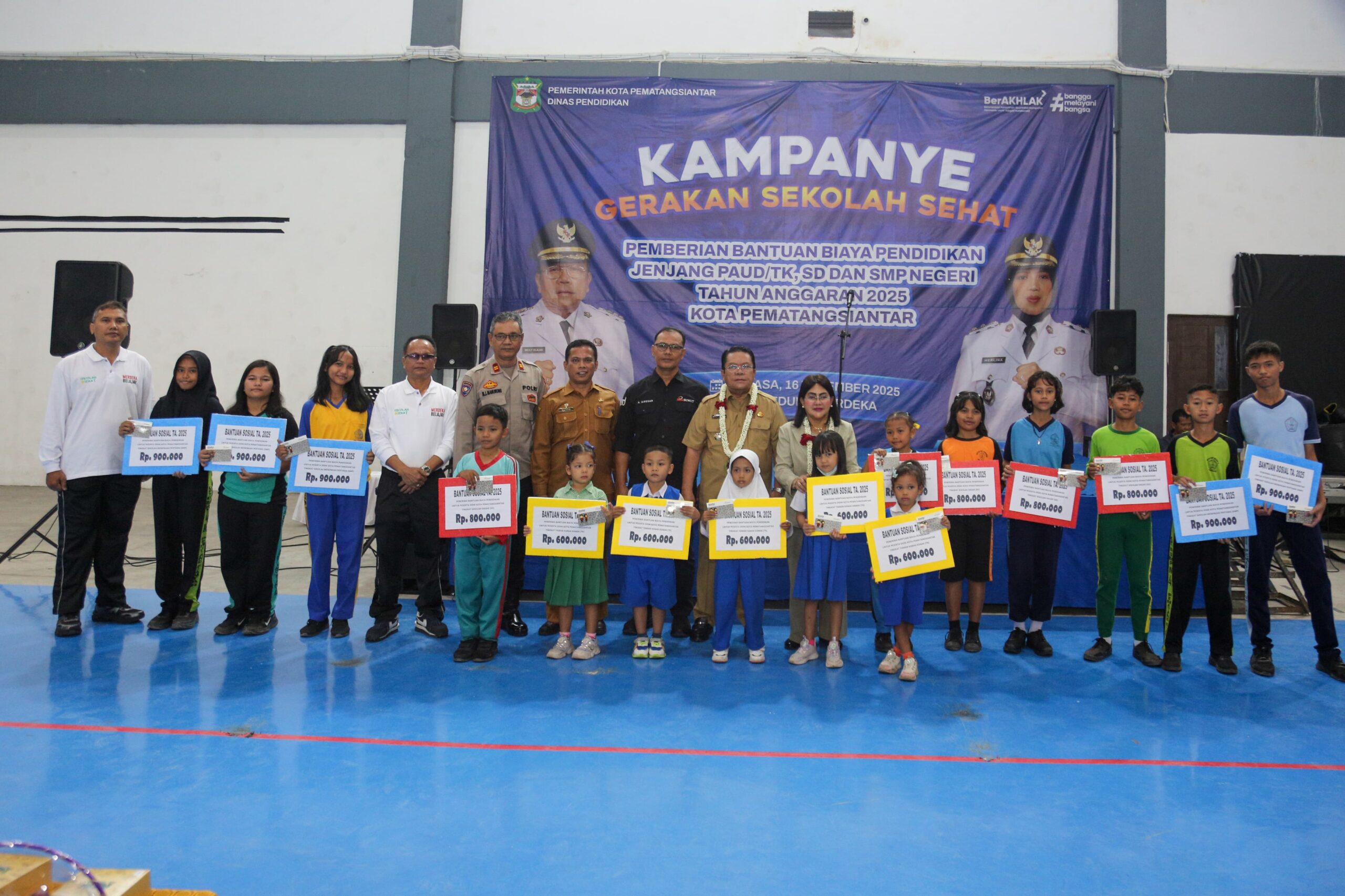 Sebelumnya, Sekretaris Dinas Pendidikan Kota Pematangsiantar Drs Risbon Sinaga MM membacakan laporan panitia. Diterangkannya, tujuan kegiatan tersebut antara lain, membantu biaya pendidikan peserta didik jenjang PAUD hingga SMP negeri; mengurangi angka putus sekolah; mewujudkan visi Kota Pematangsiantar khususnya Cerdas; serta mengimbau pihak sekolah agar menjaga ekosistem sekolah yang sehat, mulai ruangan kelas hingga lingkungan sekolah agar meningkatkan kualitas proses belajar dan mengajar.
