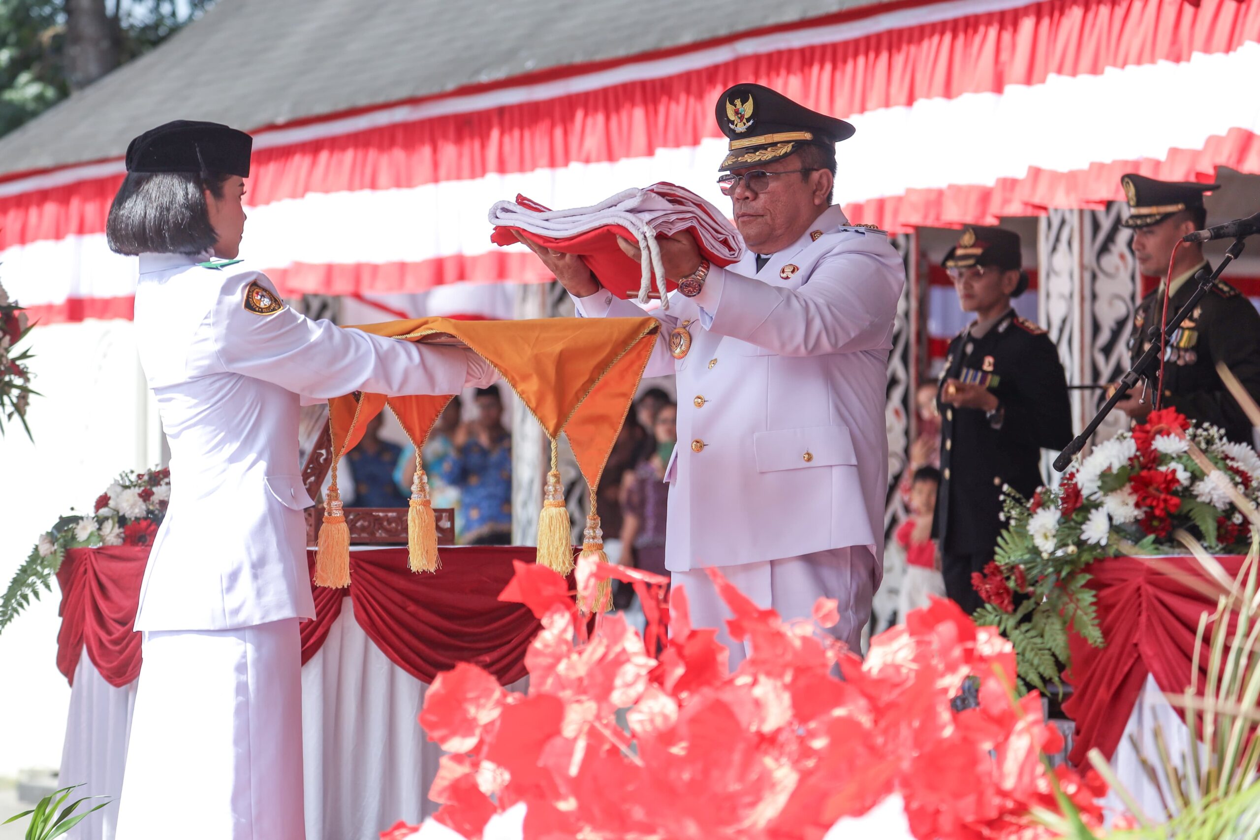Bendera merah putih berkibar di upacara peringatan Detik-detik Proklamasi Kemerdekaan Republik Indonesia (RI) ke-80 Tahun 2025, di Lapangan Adam Malik, Minggu (17/08/2025).